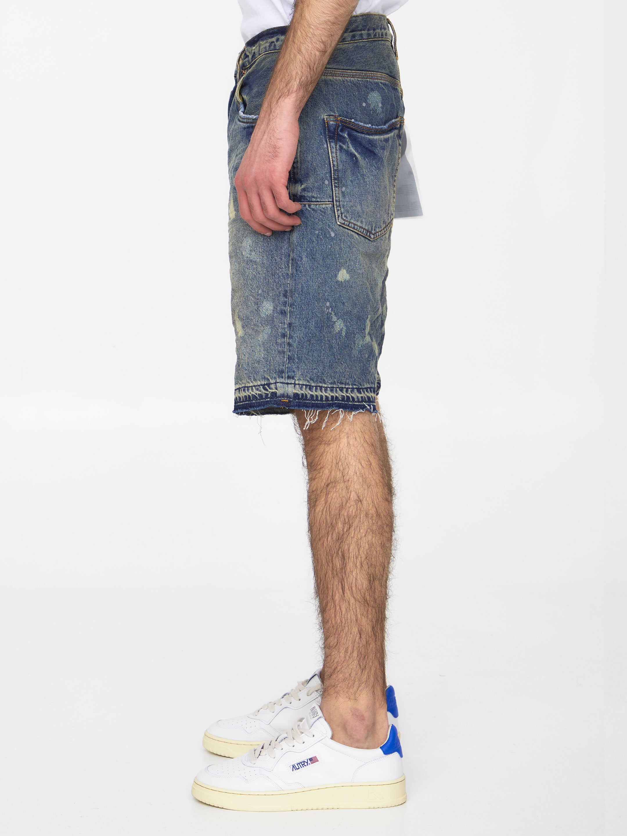 Washed-out light-blue cotton denim bermuda shorts with all-over paint-effect details. It features button closure, five-pocket design, belt loops and frayed hems. Rear leather patch.