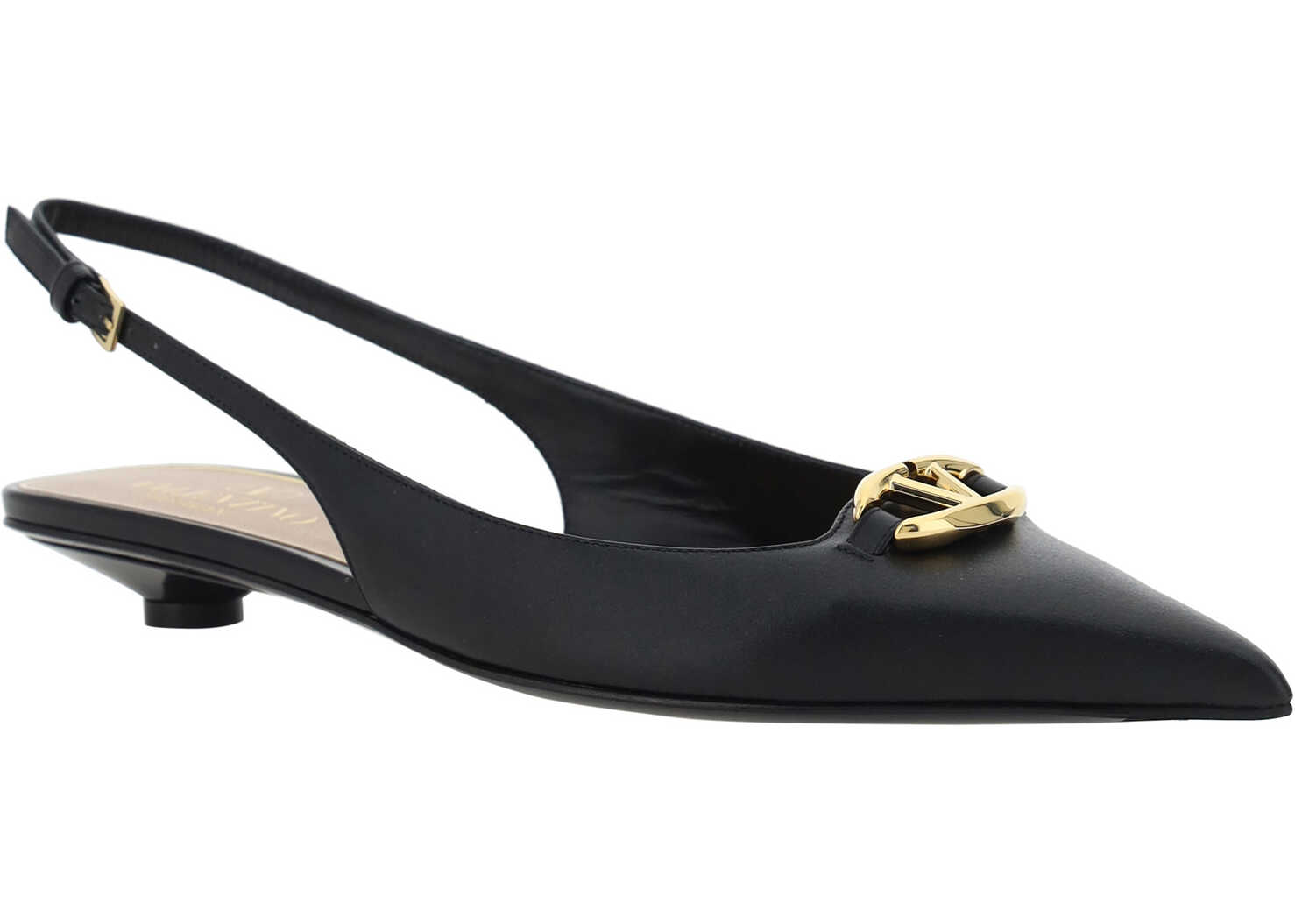 Calfskin Pums by Valentino Garavani, elongated almond toe, open heel design, leather kitten heel, back closure via slingback at heel, plaque with iconic embossed VLogo applique on front, logoed insole.