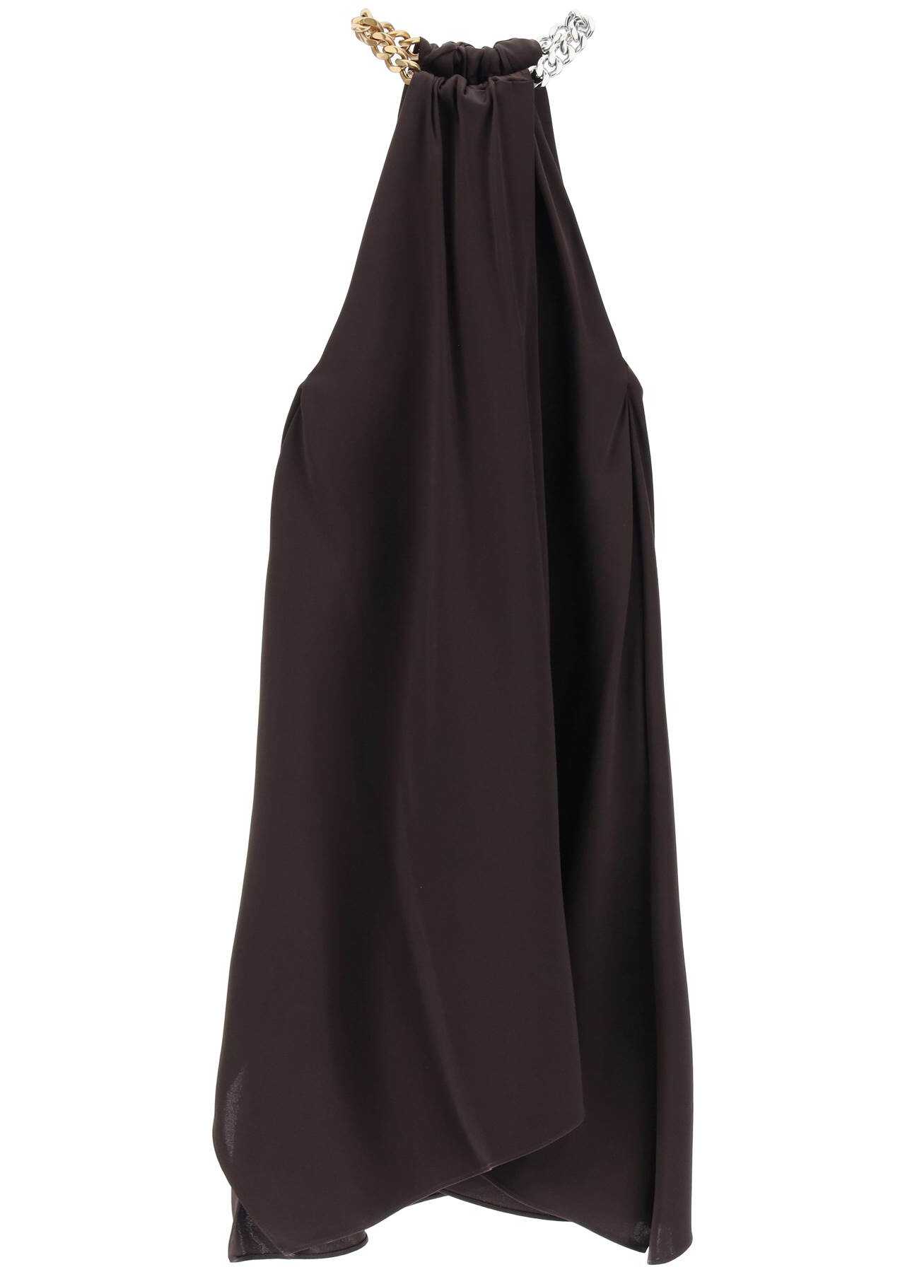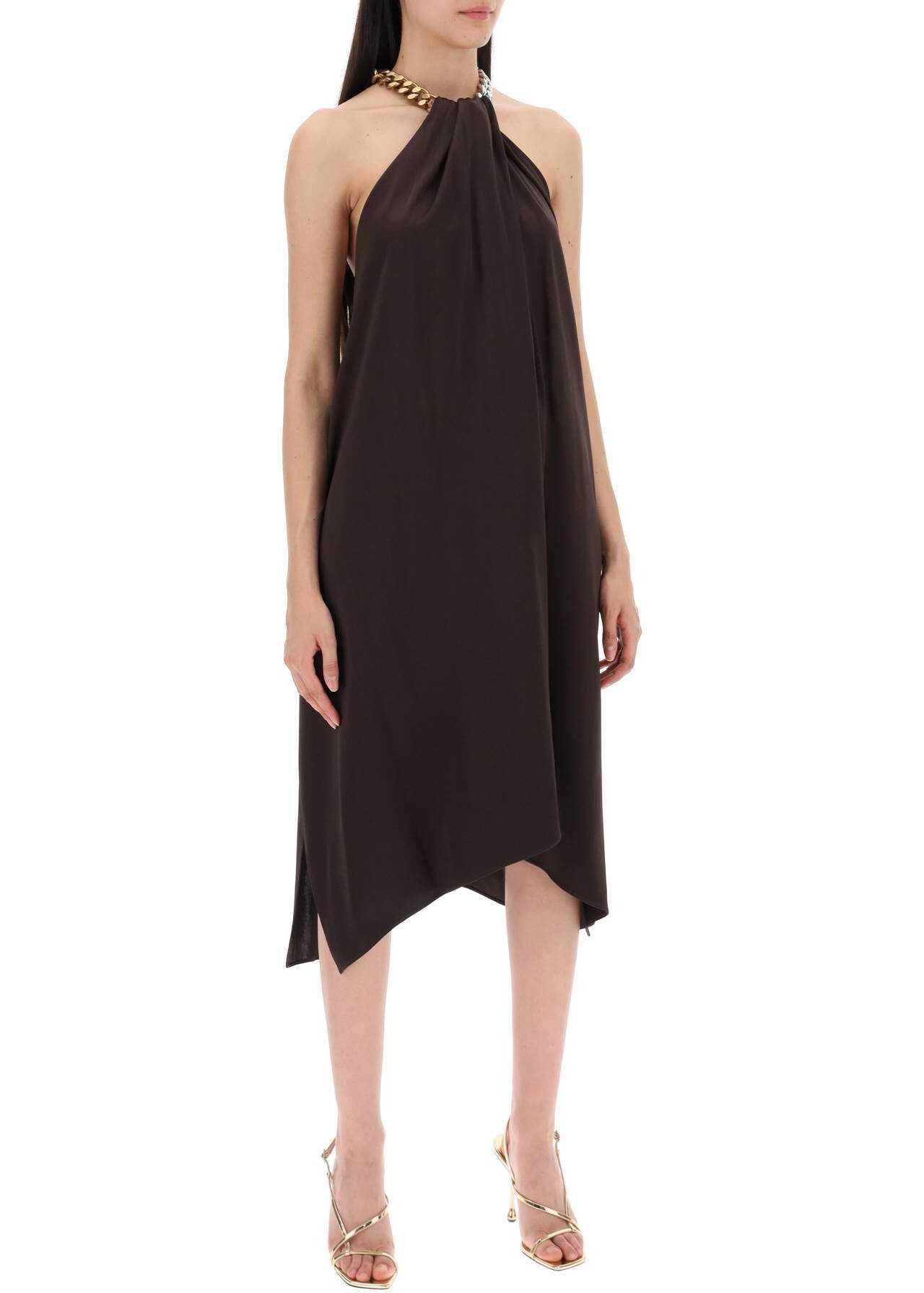 This midi dress by Stella McCartney is made of a viscose blend with a satin finish and features a collar with a mixed metal Frayme chain. It has a twisted halter neckline, an asymmetrical hemline, side pockets inserted into the seam, and two side slits. The fit is fluid and comfortable. The model is 177 cm tall and wears an Italian size 40.
