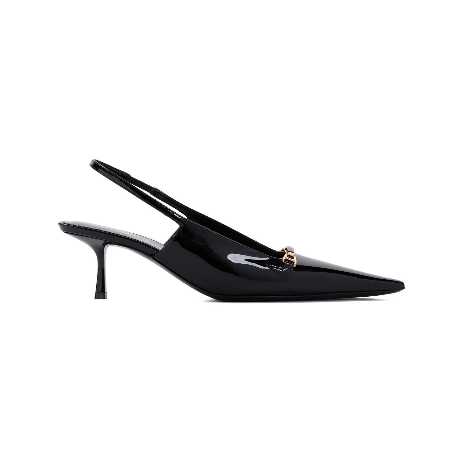 Step out in style with these elegant black patent leather pumps from SAINT LAURENT. Featuring a sleek slingback design, golden-toned hardware details, and a comfortable stiletto heel. Perfect for adding a touch of sophistication to any outfit. Elevate your look with these timeless classics.