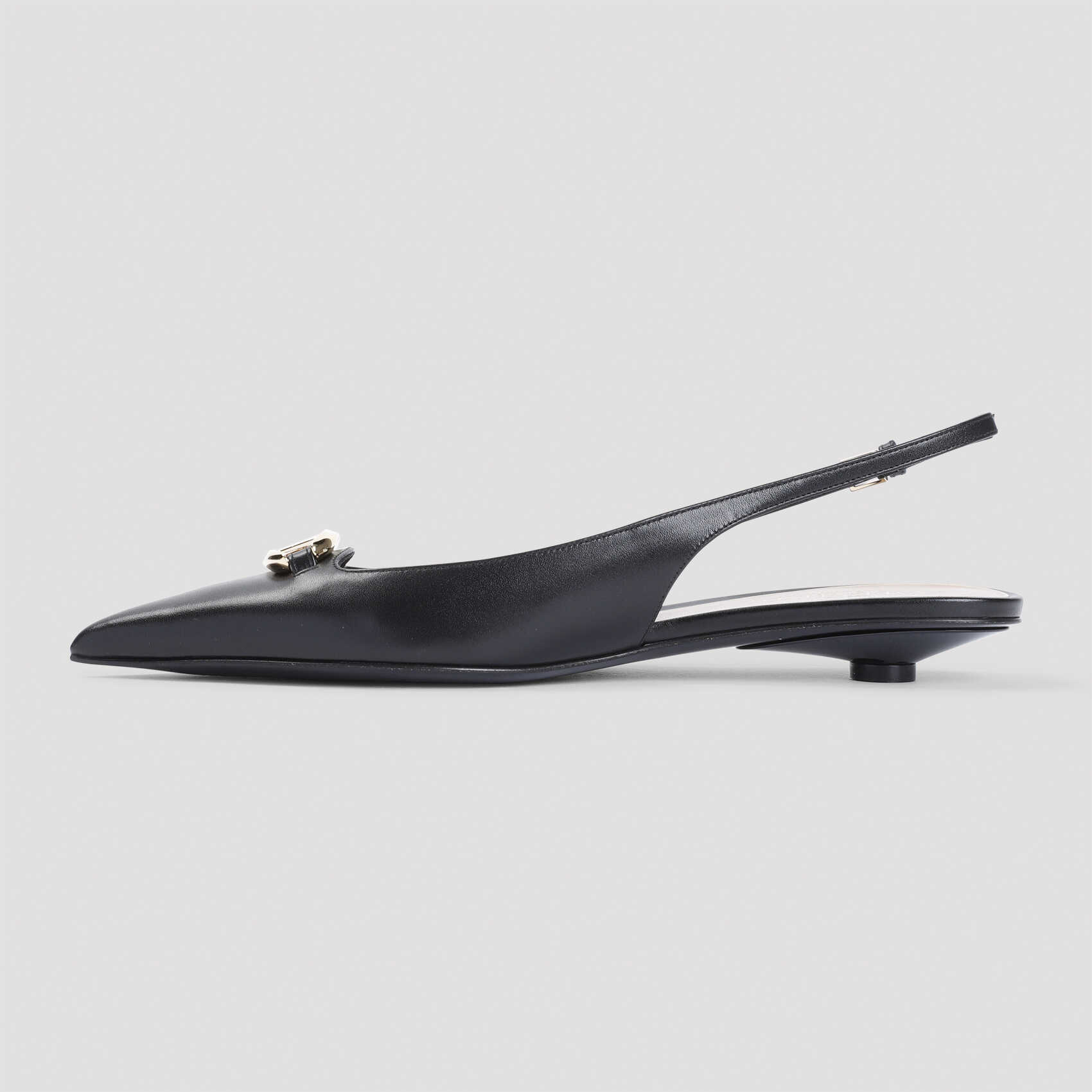Step into elegance with the Valentino Garavani black leather ballerina. Crafted from pure leather, this ballerina features a pointed toe, adjustable ankle strap, and a stylish kitten heel. The metallic gold-tone signature V logo adds a touch of luxury. Perfect for any occasion, this timeless piece is a must-have for every fashion-forward woman. Elevate your style with Valentino Garavani.