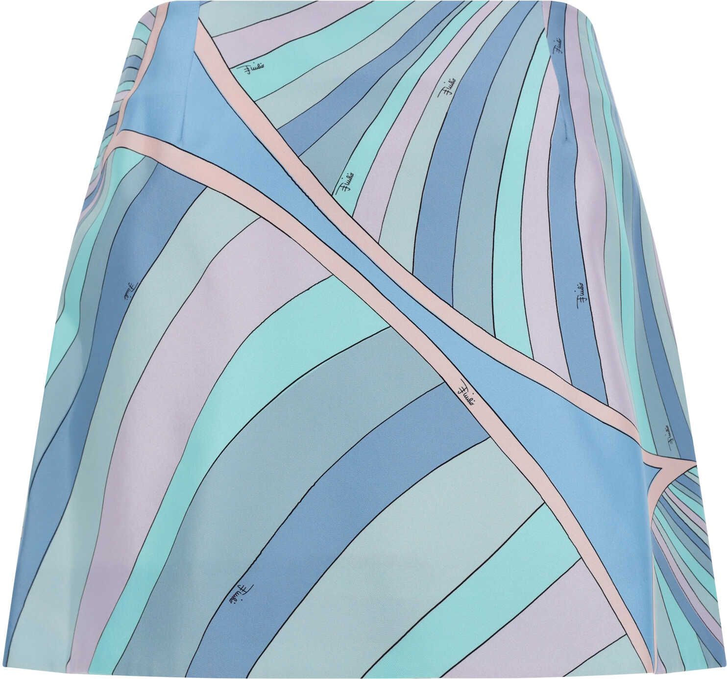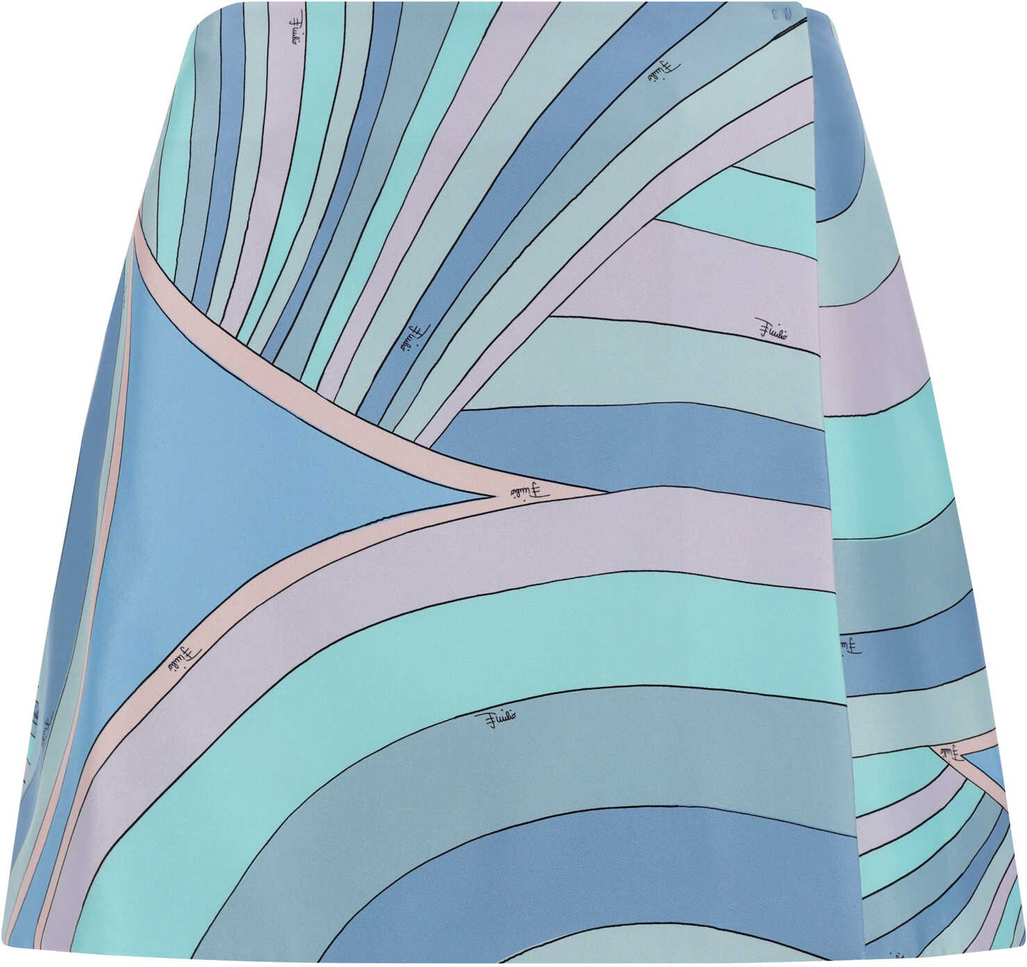 Silk Mini Skirt by Pucci, wrap design with front snap-button closure, high-waisted pattern, iconic all-over repeated brand Iride print.