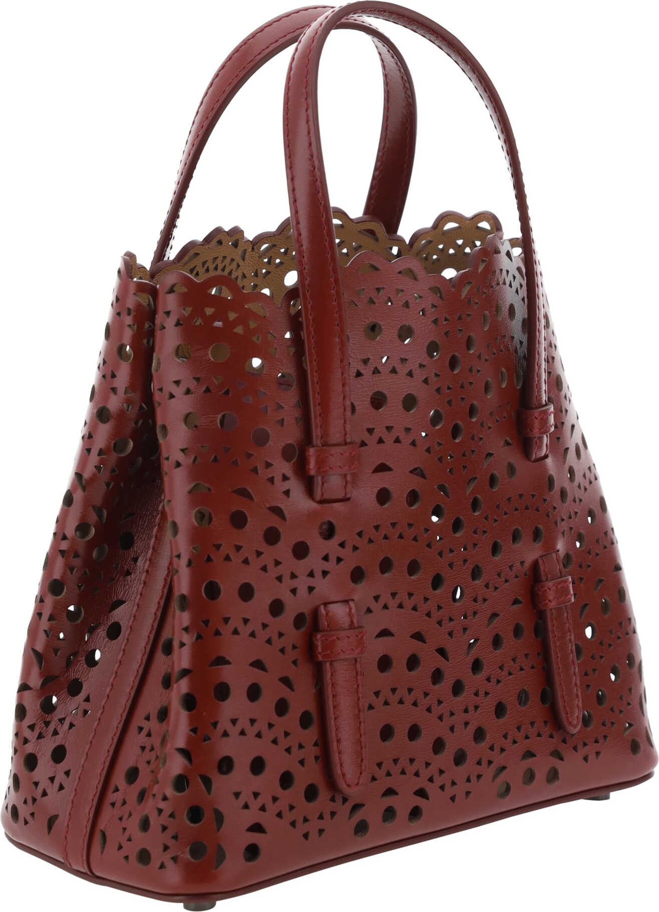 Calfskin Mina 20 Handbag by Alaïa, design with perforated geometric details, two top handles, single interior compartment, adjustable shoulder strap, removable pouch by snap hooks, metal support feet attached to base of bag.