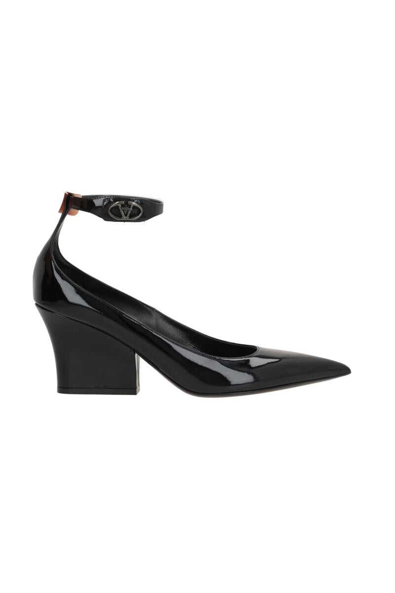 Valentino Garavani's pumps crafted in black patent leather. Featuring ankle strap with VLogo Signature twist-lock closure, a point-toe silhouette, leather lining and leather sole. The design is completed by a patent leather-covered block heel.