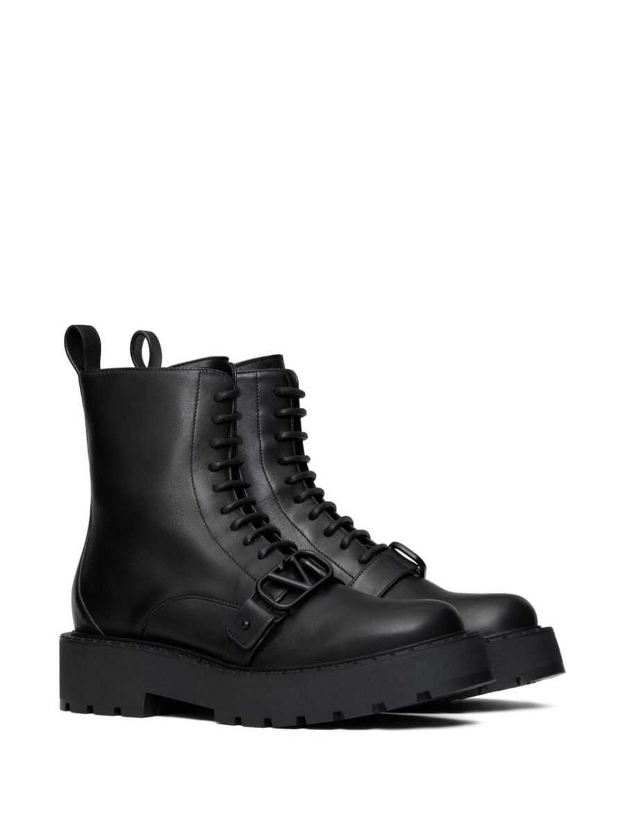 Valentino Garavani's combat boots crafted in black smooth leather. Featuring side zip closure, front laces, a round-toe silhouette, leather lining and lug rubber sole. The design is completed by front decorative strap embellished by the iconic metal VLogo Signature buckle.