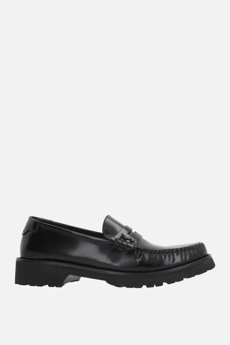 Saint Laurent's loafers crafted in black shiny leather. Featuring an almond-toe silhouette, leather lining and lug rubber sole. The design is completed by the unmistakable logo embossed at heel and metal interlocking YSL signature on side.