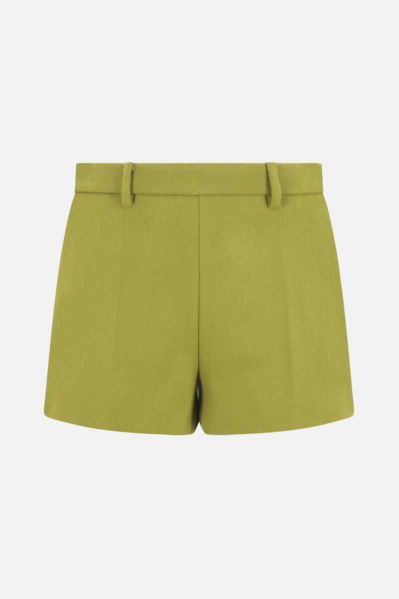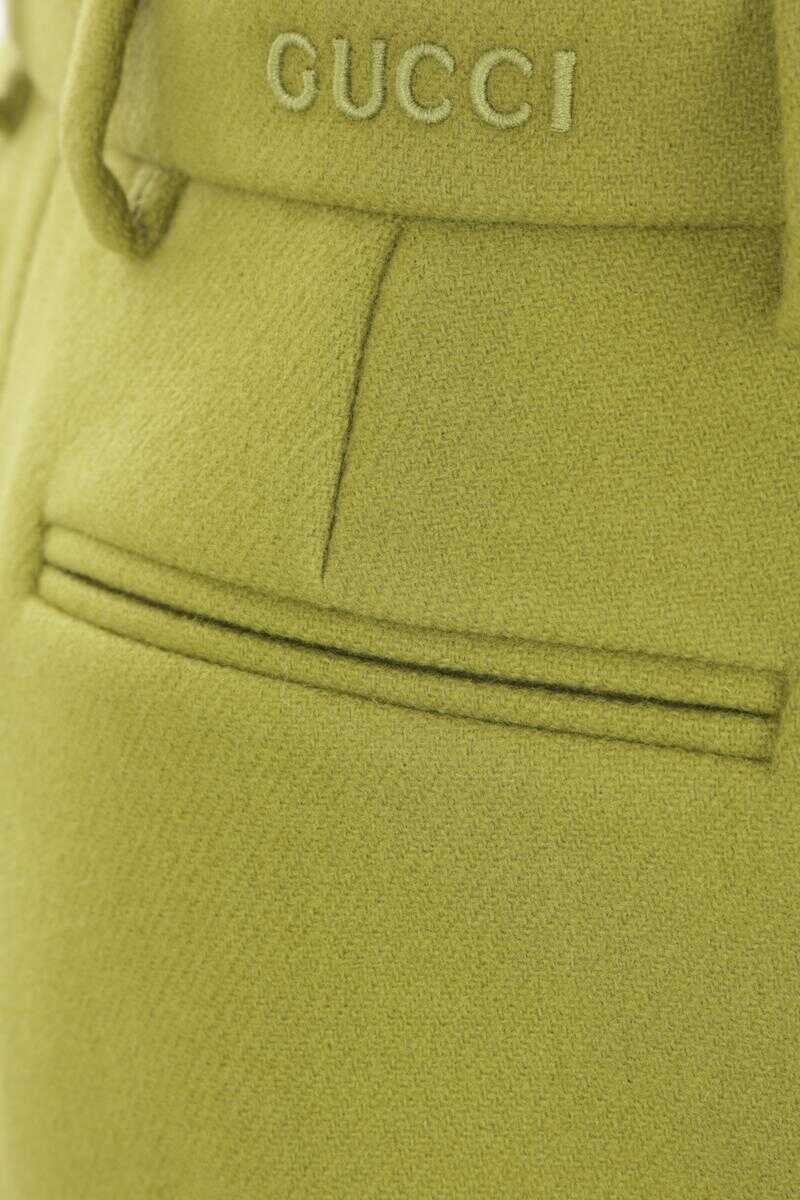 Gucci's shorts crafted in pistachio green batavia wool cloth with lettering logo embroidery at back waist. Featuring side hook / concealed zip closure, belt loops, multiple pockets, central pressed crease and lined interior.