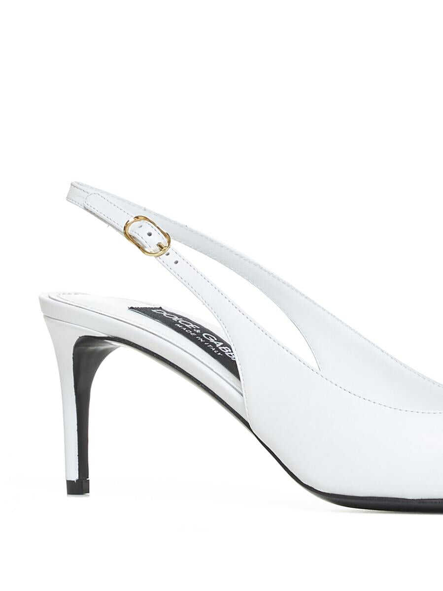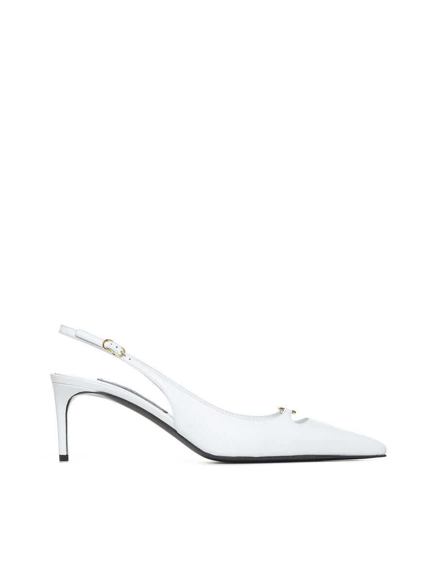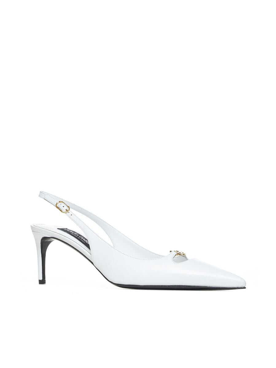 Dolce & Gabbana’s white leather slingback pumps featuring a pointed toe, front strap with DG logo plaque, adjustable back strap and stiletto heel.