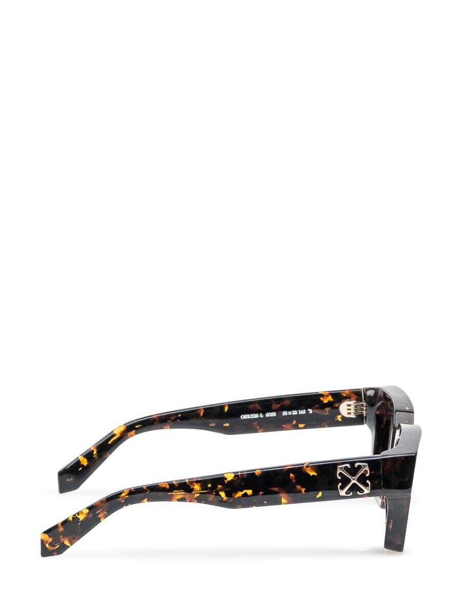 Havana-colored sunglasses. Thick square frames. Dark lenses. Side logo.