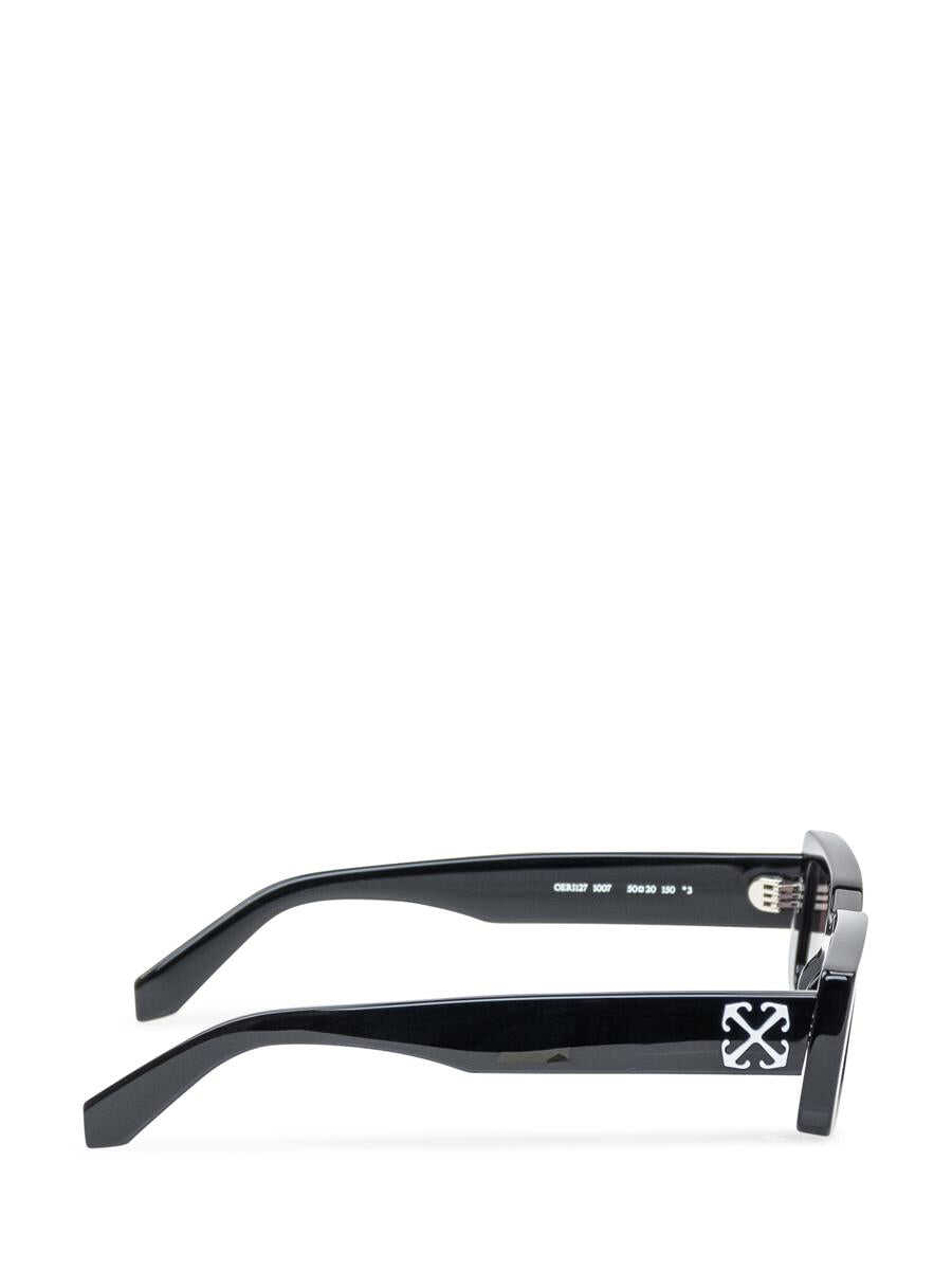 Black sunglasses. Rectangular frame. Dark lenses. Logo on the side.