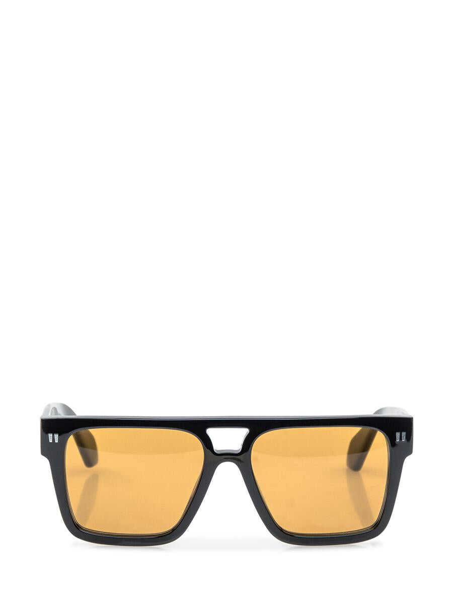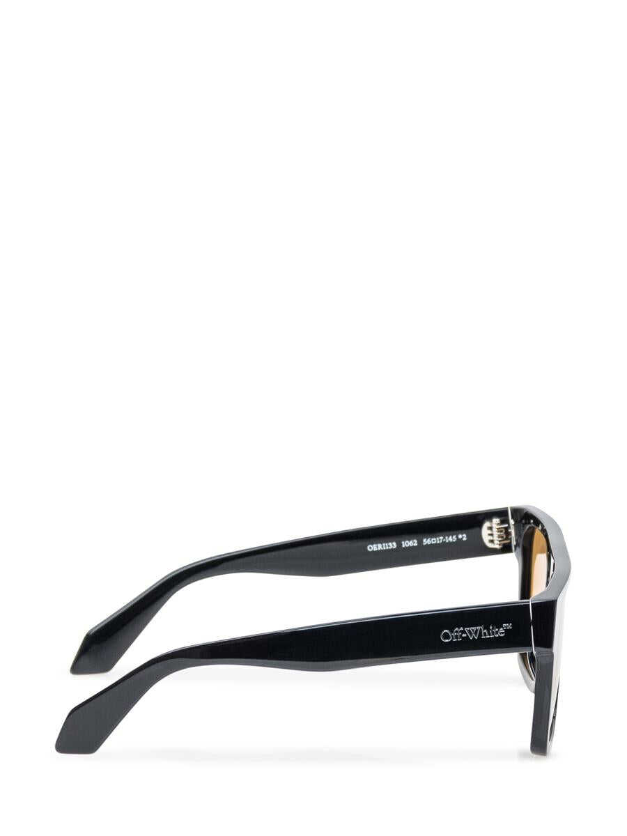 Black sunglasses. Thick square frames. Dark lenses. Side logo.