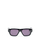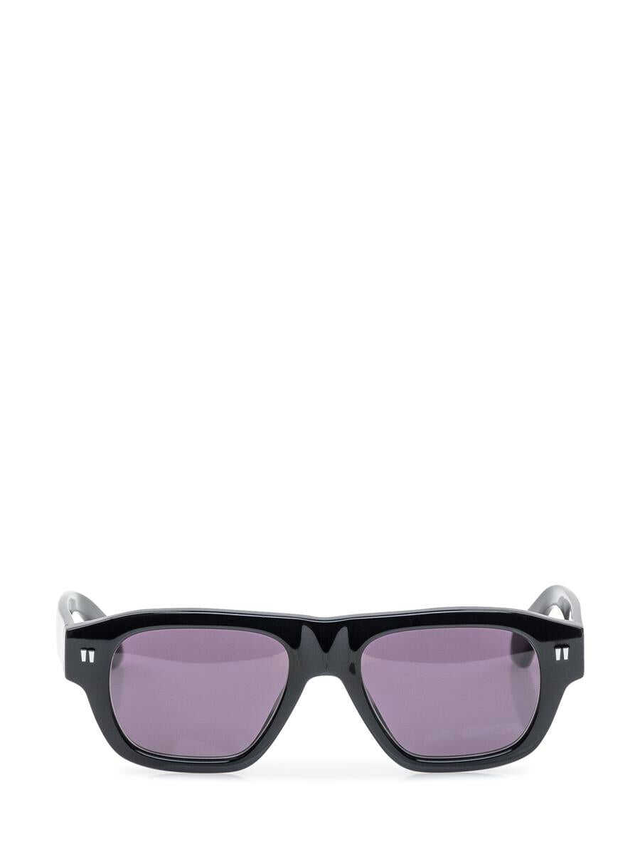 Black sunglasses. Square frame. Dark lenses. Logo on the side.