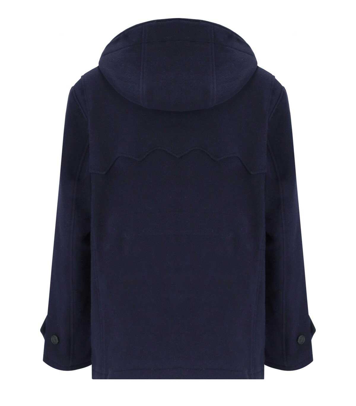 Montgomery Double Wool Short Duffle Jacket by Baracuta, made of a wool blend in navy blue. Characterized by a button closure, it features a hood and a sunshade at the back. Equipped with long sleeves with adjustable cuffs, it has two large patch pockets on the front decorated with frog buckle. Adorned with a button towards the bottom on the front. Regular fit.