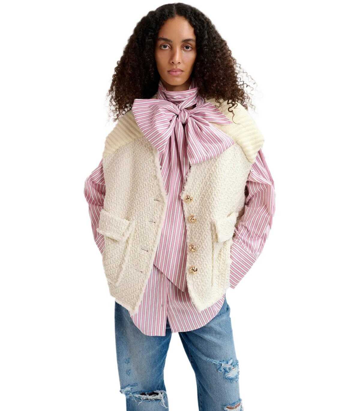 Geologic sleeveless jacket by Essentiel Antwerp made of wool-blend tweed in ecru color. Characterized by a front closure with golden buttons, it features front patch pockets. Equipped with an inner lining, it has ribbed shoulders and back. Finished with raw edges. Oversized fit.
