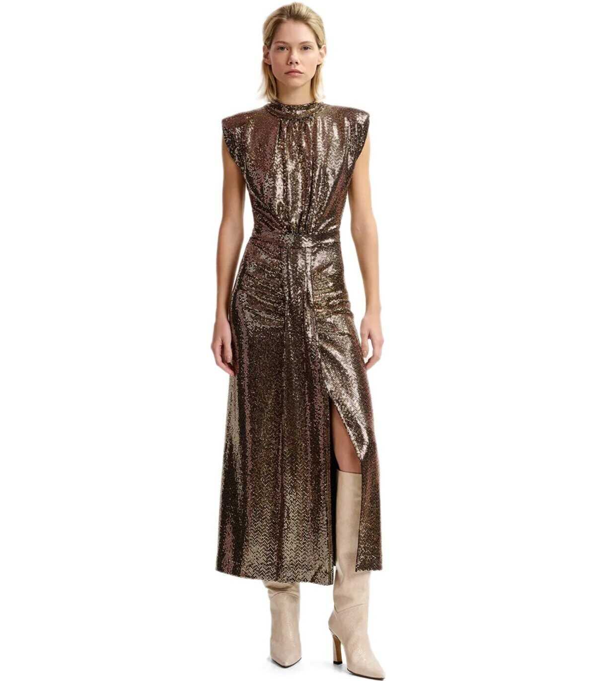 Midi dress by Essentiel Antwerp made of stretch jersey fabric in gold color. Adorned with polka dots for a glitter finish, it features a fitted silhouette and a hugging skirt embellished with box pleats ending at the back with a slit. Equipped with a hidden zip closure, it has slightly padded shoulders and a mock high collar. Partially lined. Regular fit.