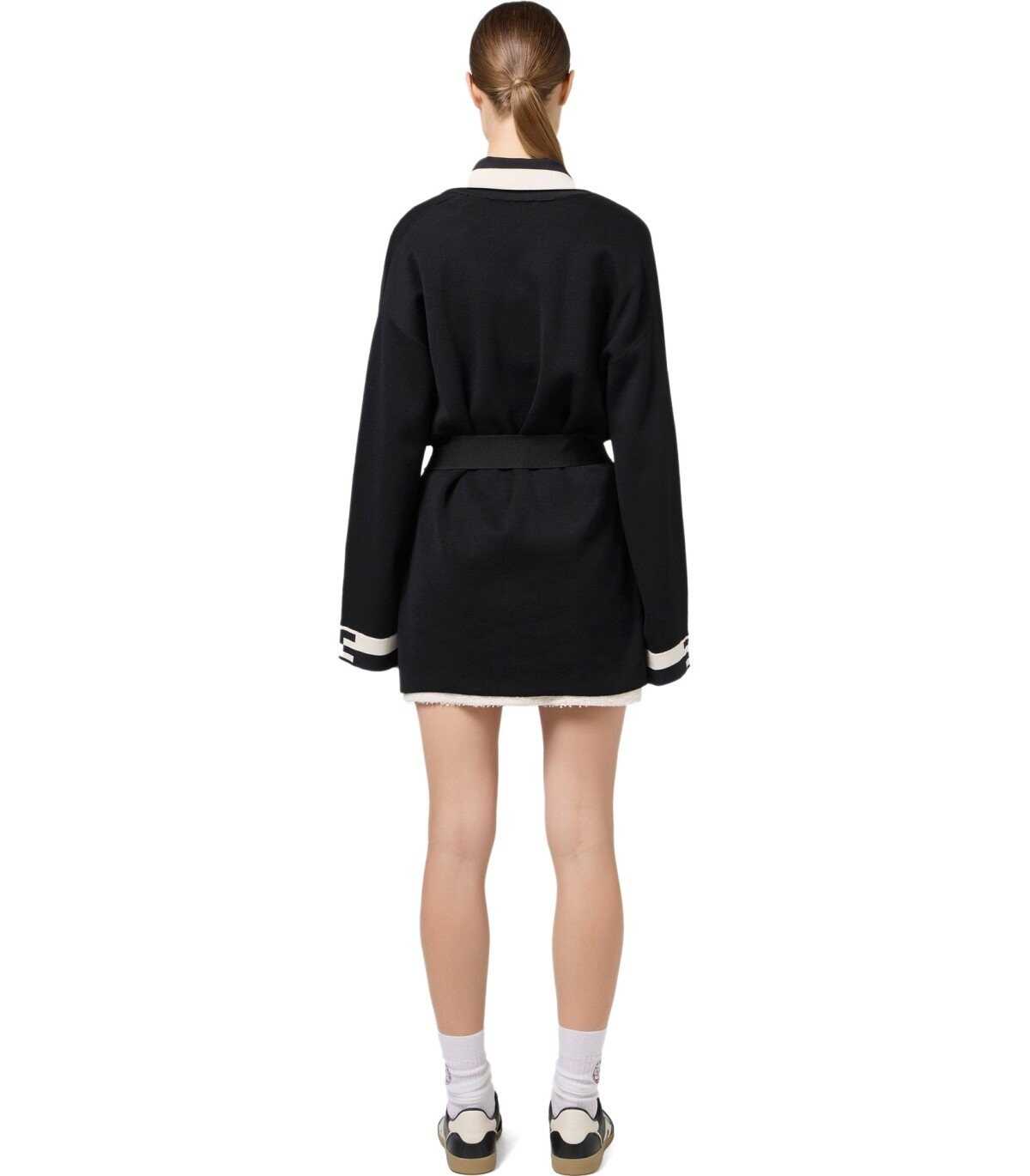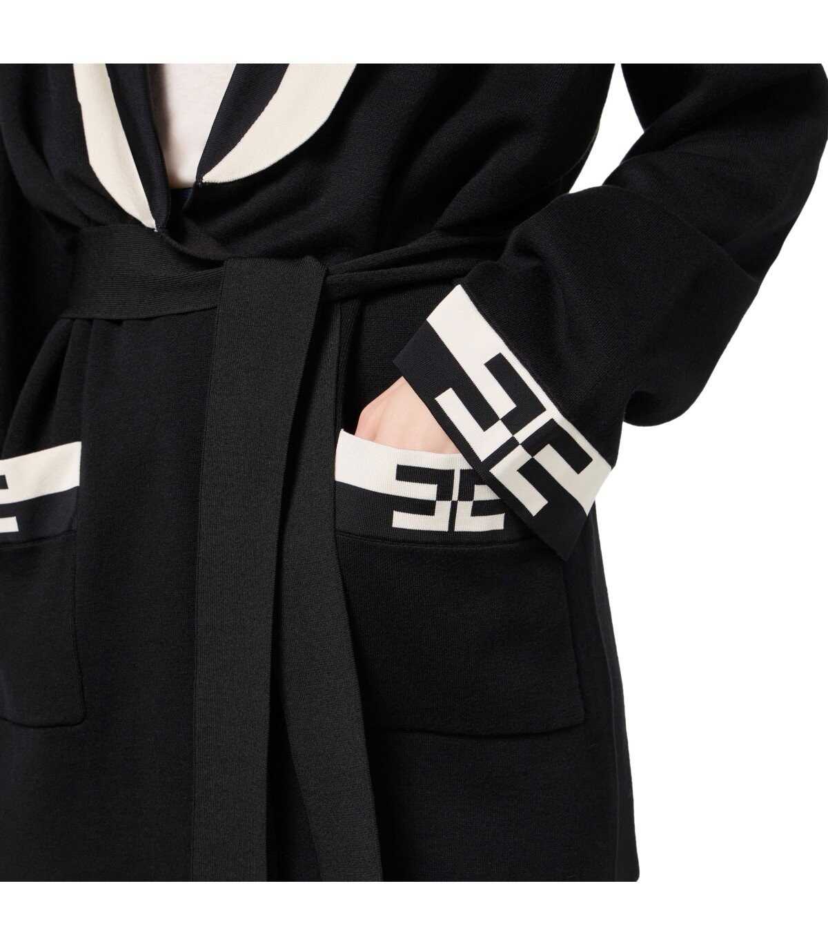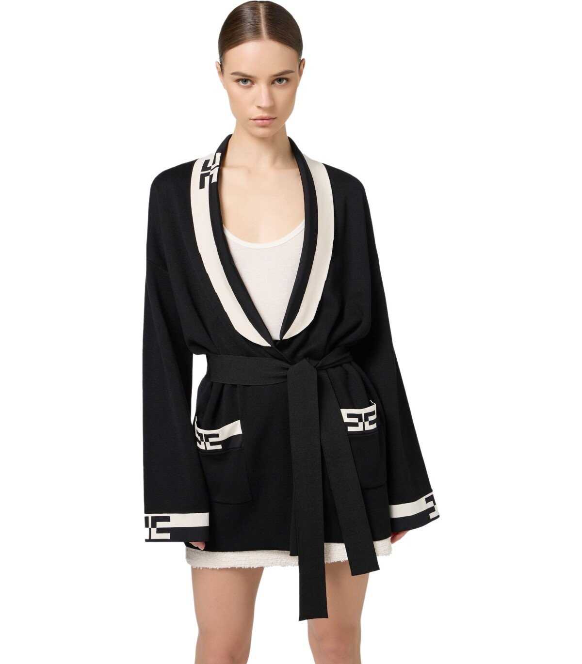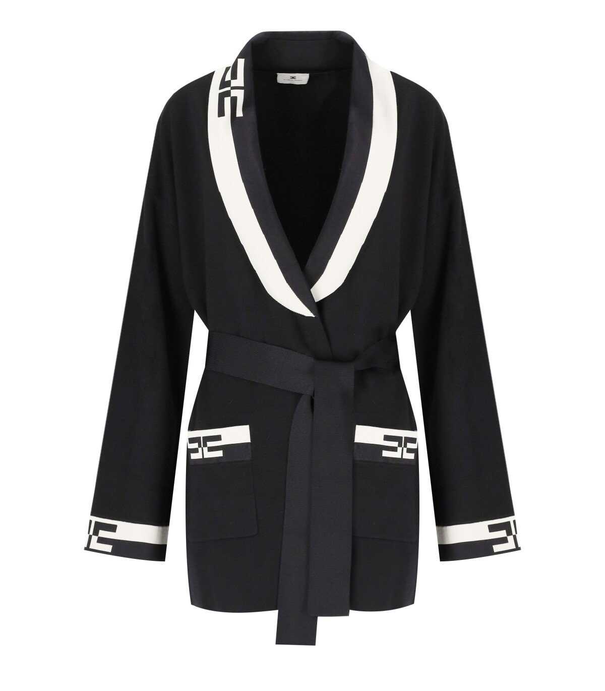 Cardigan by Elisabetta Franchi made of matte viscose in black/cream color. Characterized by long sleeves, with a pointed lapel collar. It has patch pockets and a waist belt. Adorned with bicolor bands with a contrasting logo. Regular fit.