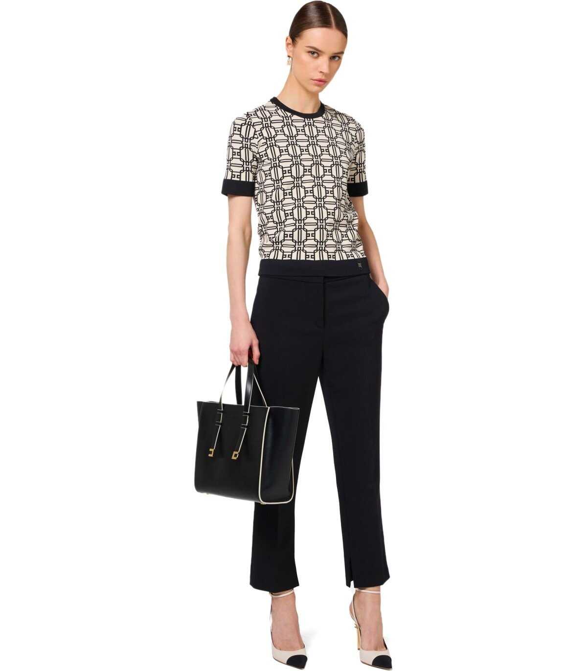 Trousers by Elisabetta Franchi made of a cotton blend polyester in black. Characterized by a straight line, it features two open pockets in the front. Gold logo at the waist. Slim fit.
