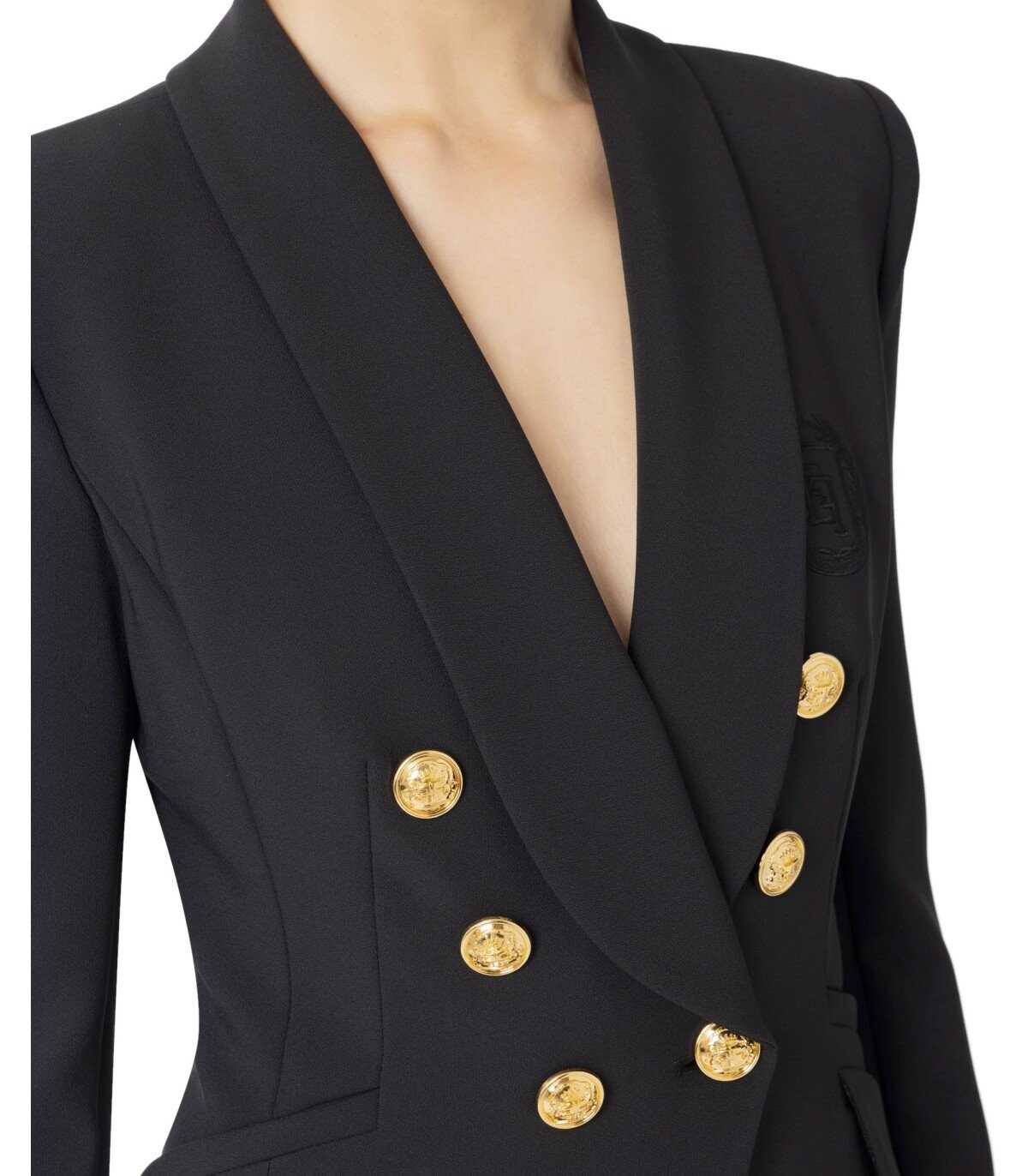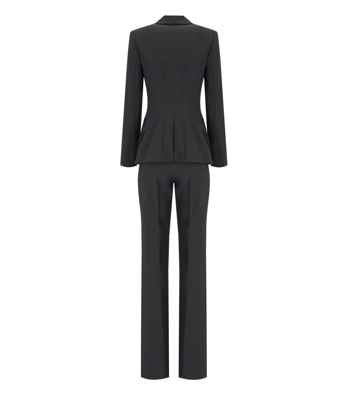 Elisabetta Franchi suit made of double stretch crêpe in black. Characterized by a monogram satin inner lining, it features a double-breasted jacket with welt pockets, adorned with precious gold buttons. Palazzo pants with an invisible zip on the side. Logo emblem on the chest. Slim fit.