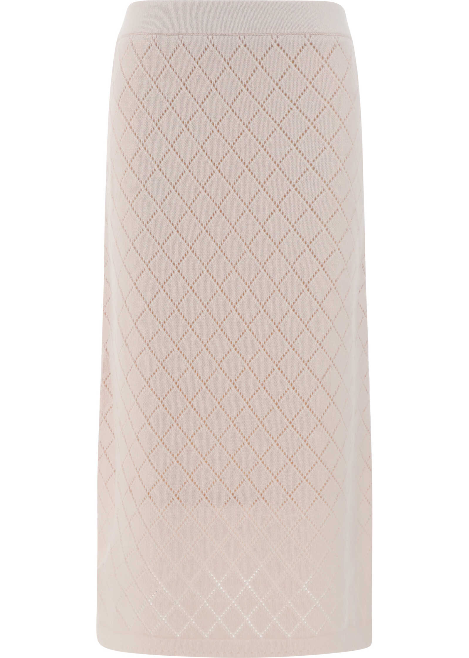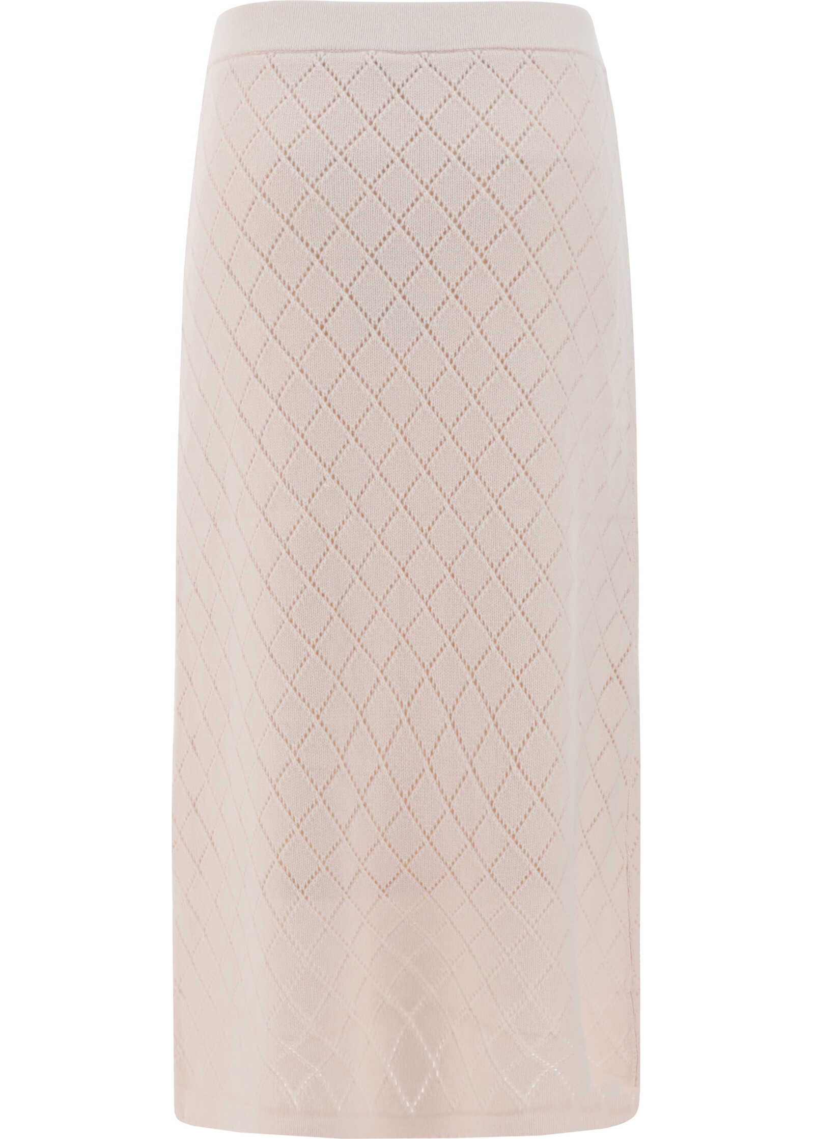 Wool Midi Skirt by Zimmerman featuring elasticized waistband, ribbed hem, perforated knit design, monochrome pattern, close fit.