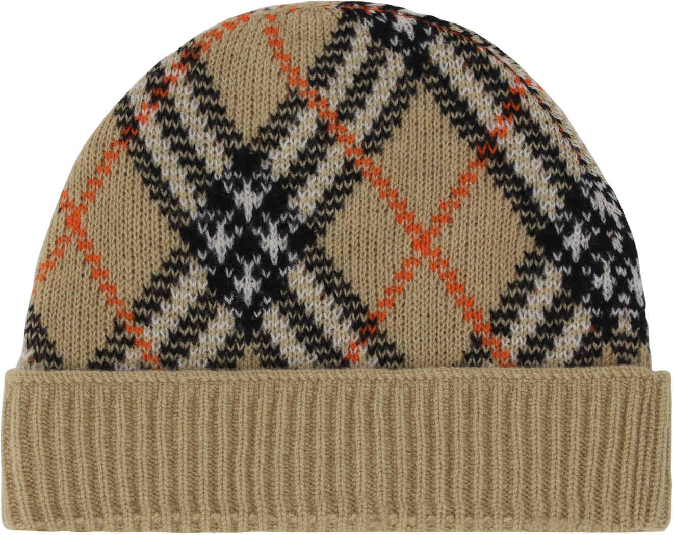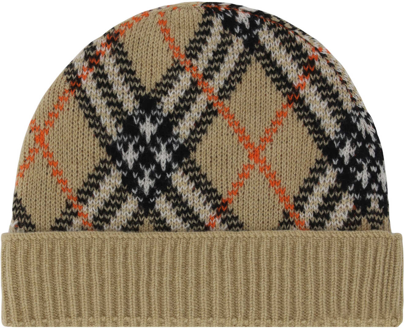 Cashmere Beanie Hat by Burberry, turned-up hem, iconic all-over repeated brand Archivio Check pattern.