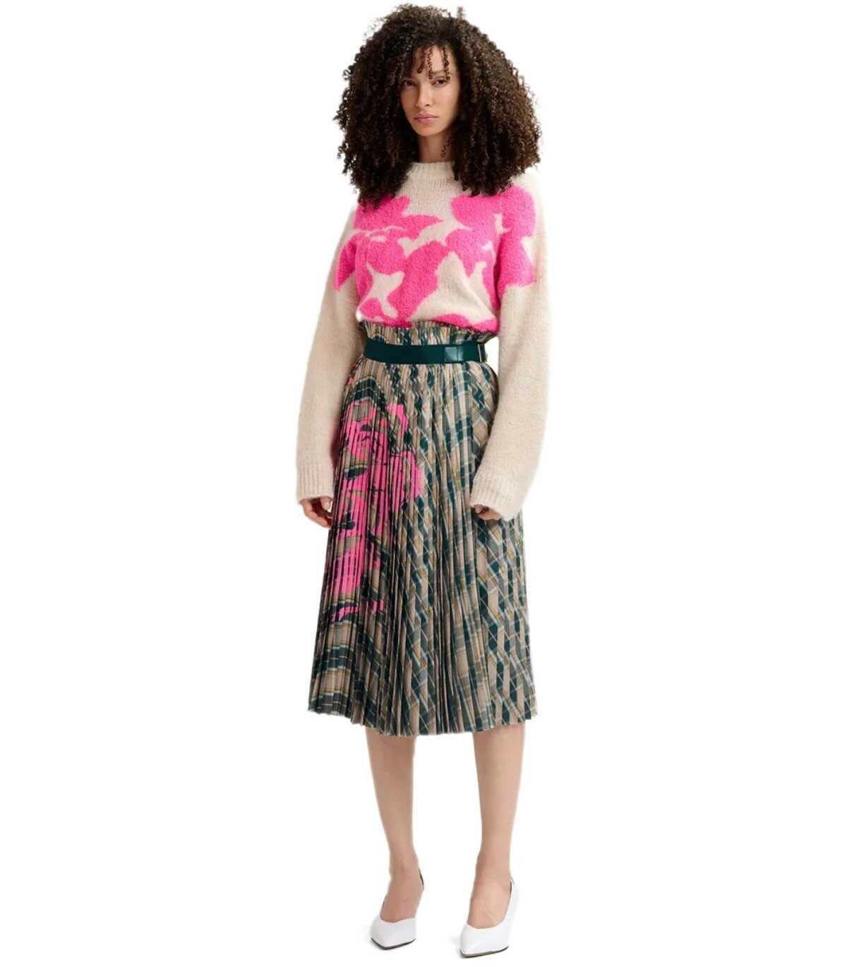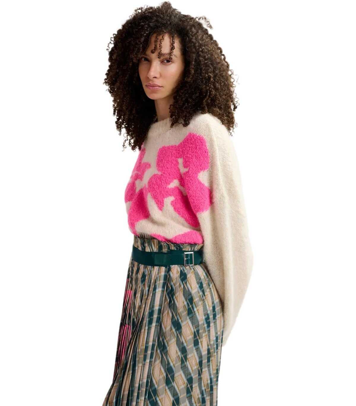 Essentiel Antwerp Garcon jumper made with knit fabric in ecru and neon pink tones. Characterized by intarsia work, it features a floral design. It has long sleeves and elongated shoulders finished with ribbed edges. Oversized fit.
