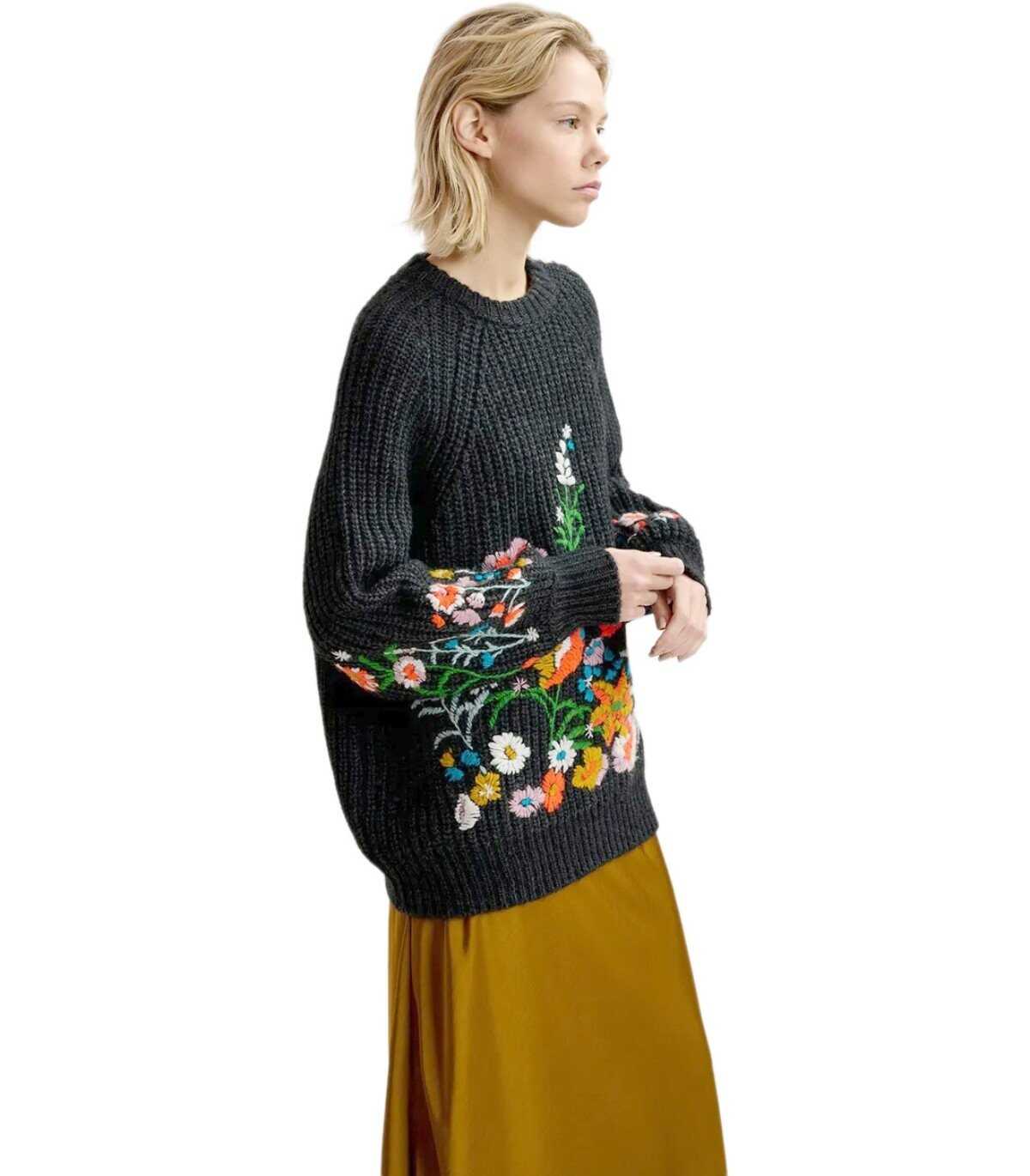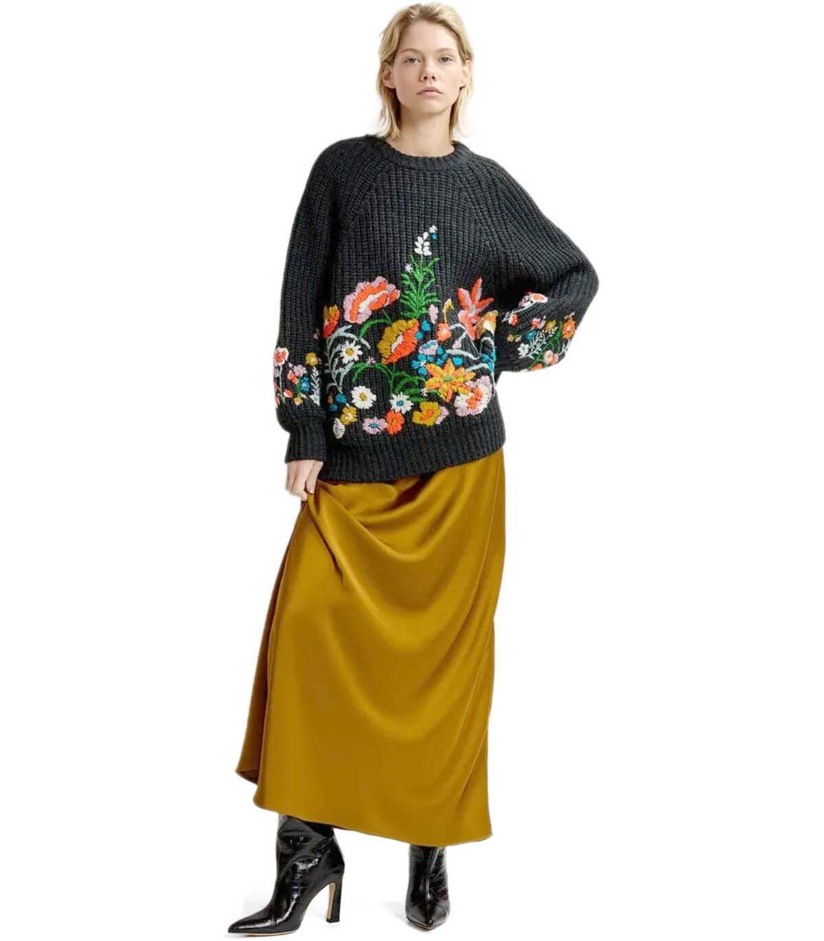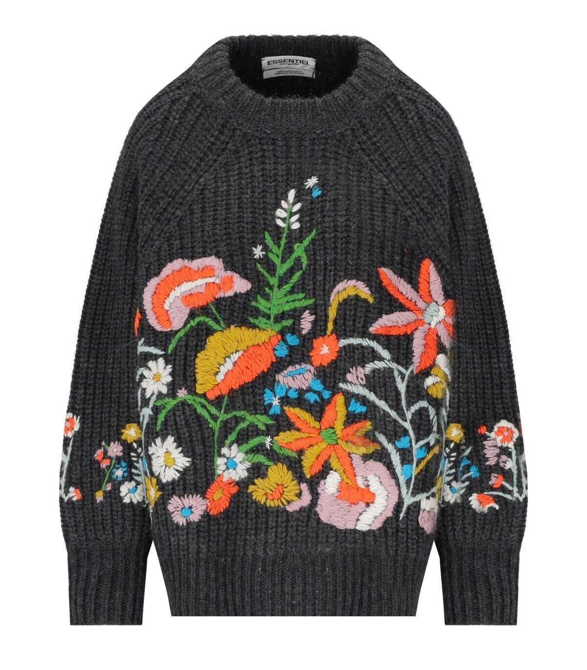 Glossy jumper by Essentiel Antwerp made of a wool blend in dark gray, ochre, and orange tones. Characterized by a ribbed texture, it features long sleeves adorned with hand-embroidered floral details. It has dropped shoulders. Oversized fit.
