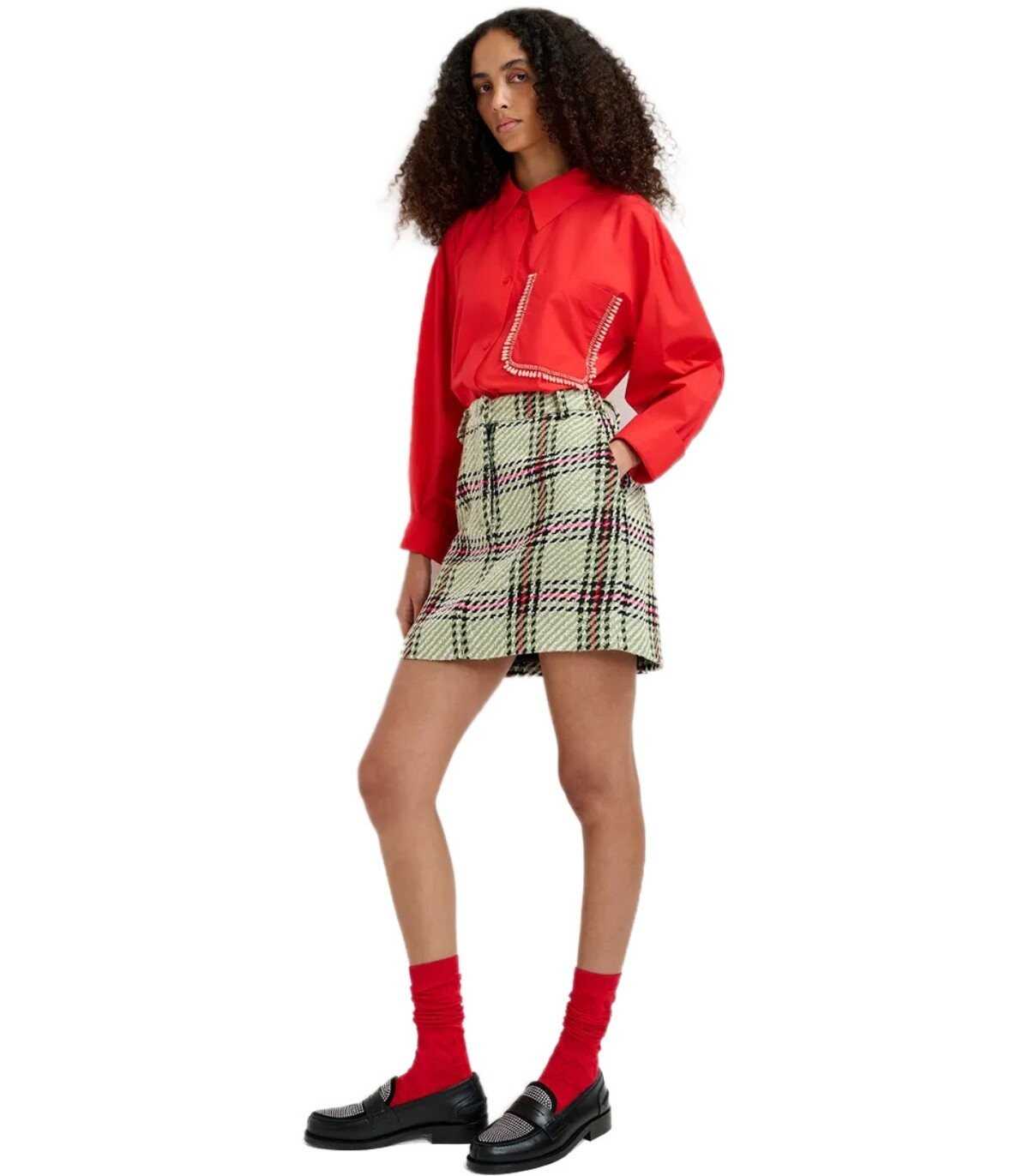 Graphics2 skirt by Essentiel Antwerp made of non-stretch fabric with a checkered pattern in shades of ecru, black, and green. Characterized by a zip and button closure, it features a slim A-line shape. Equipped with a small slit at the back, it has angled front pockets and back waist pockets. Waist with belt loops. Fitted silhouette.