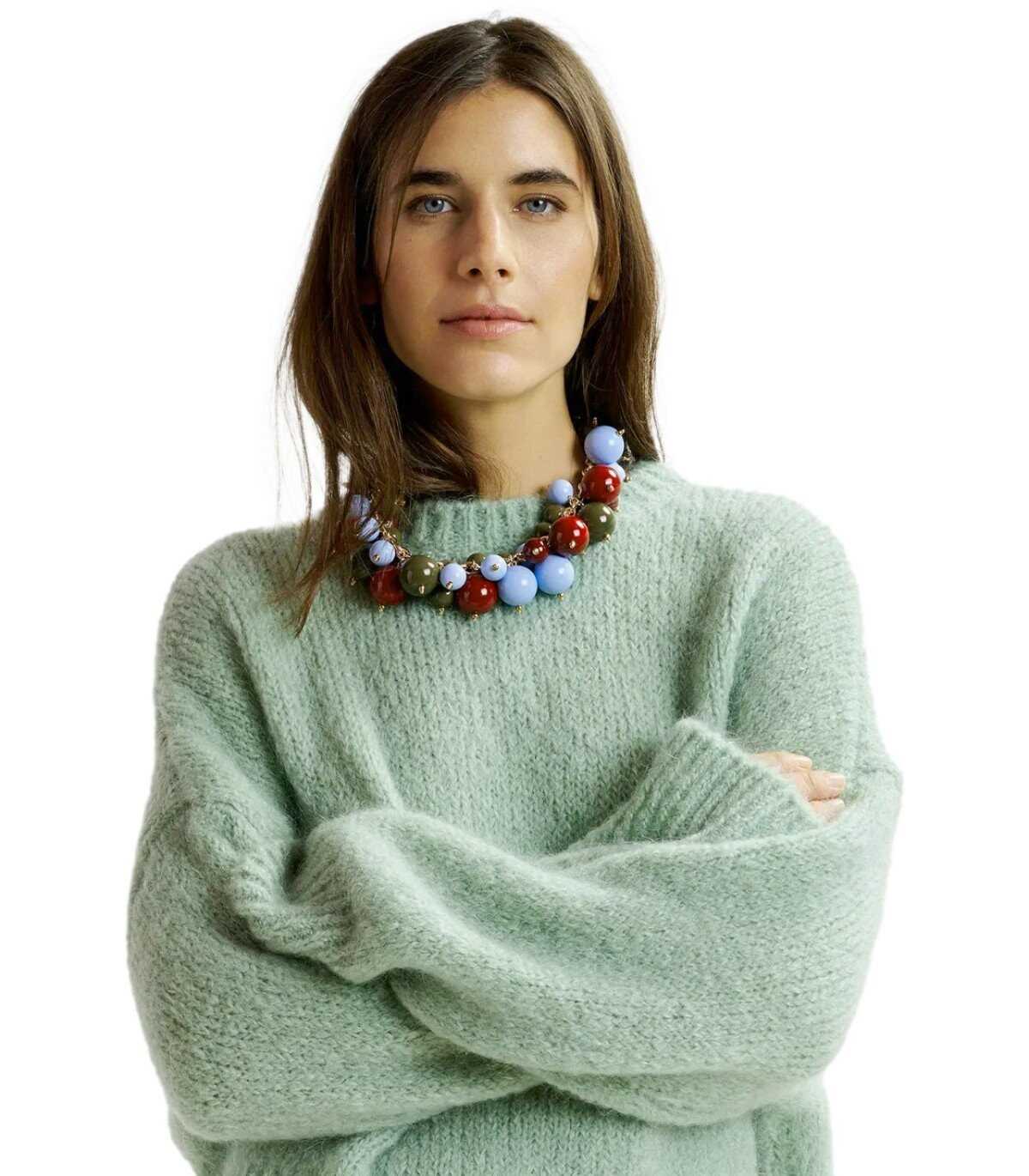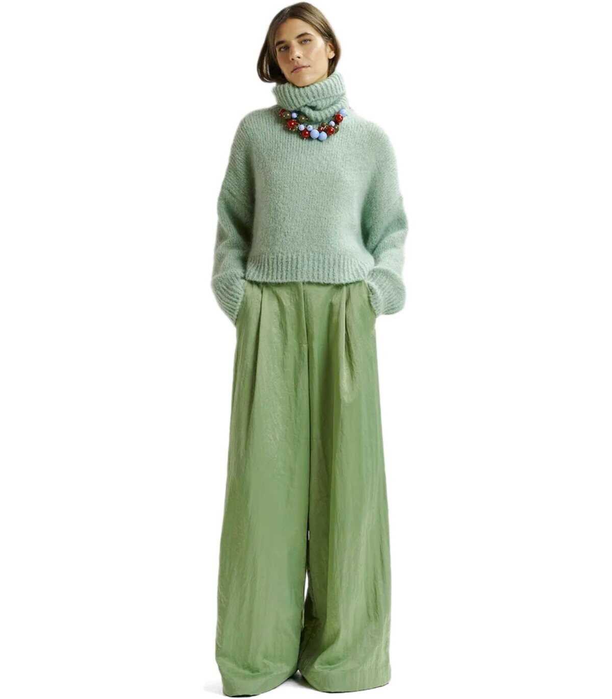 Essentiel Antwerp turtleneck sweater made of mohair fabric in light green. Characterized by long sleeves with dropped shoulders, it is finished with ribbed edges and a removable collar. It has a large, square silhouette. Oversized fit.