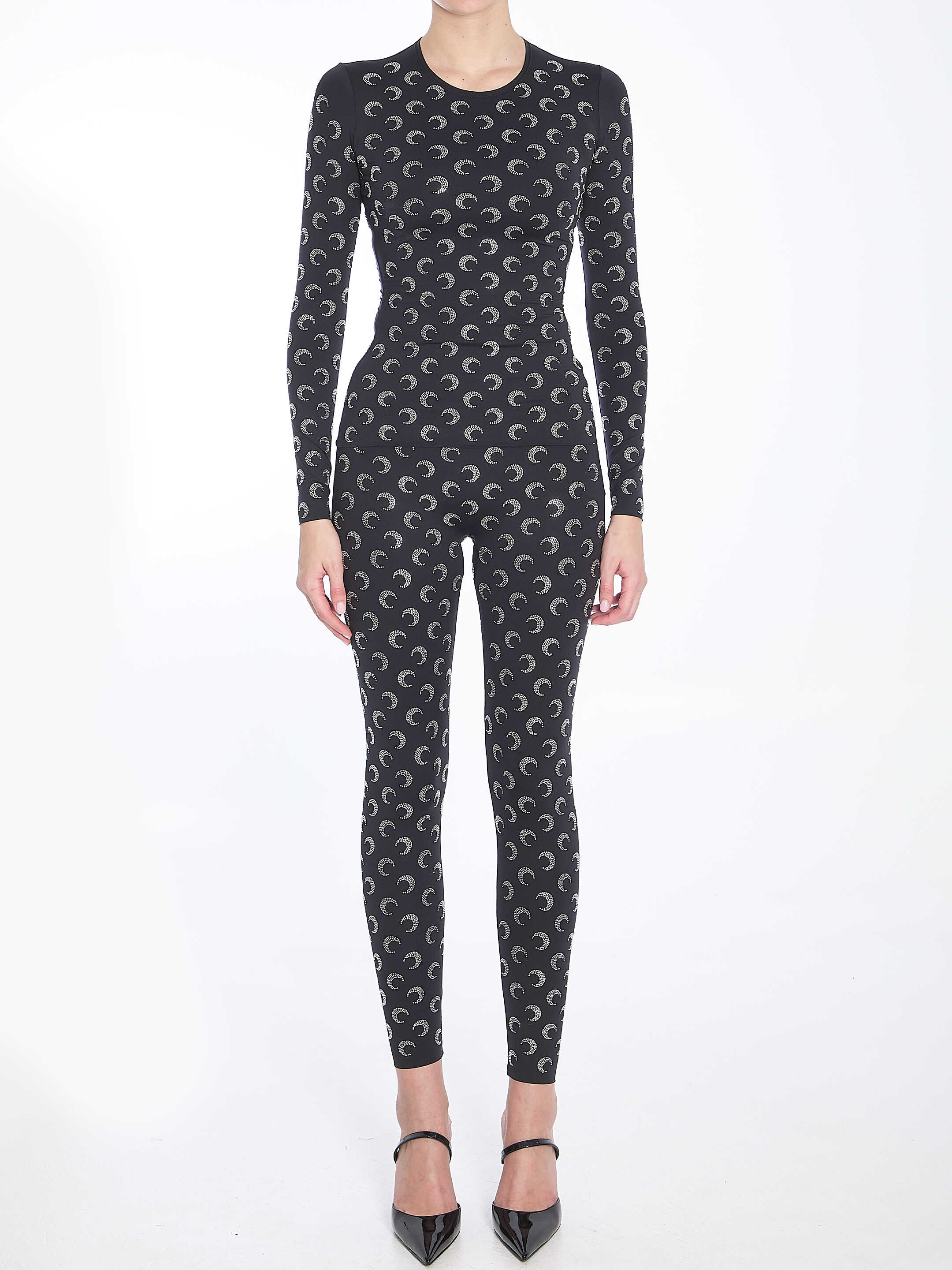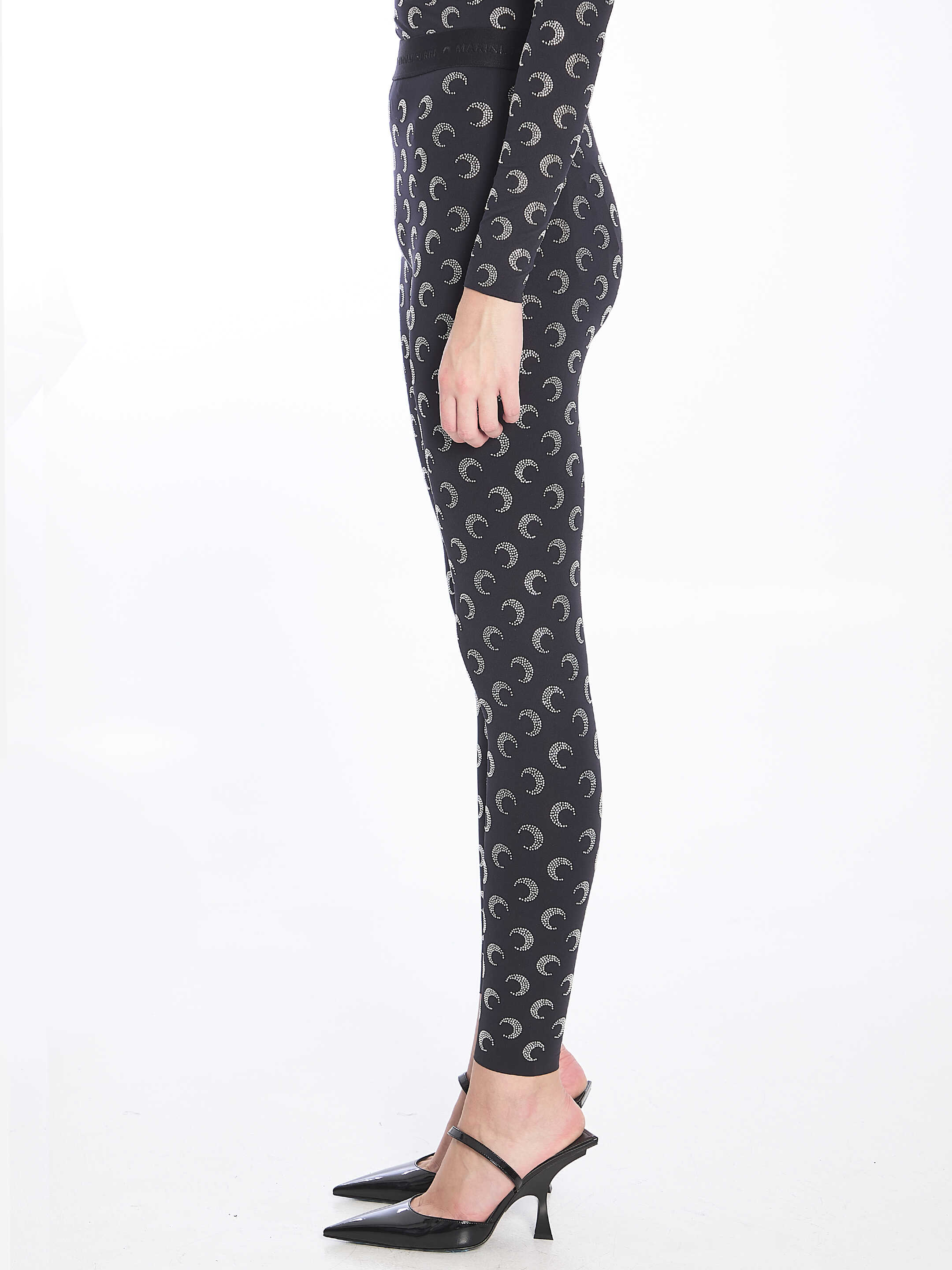 Leggings in black jersey with all-over Moon rhinestones. It features elasticated waistband with Marine Serre logo. Second-skin effect. Tight fit.