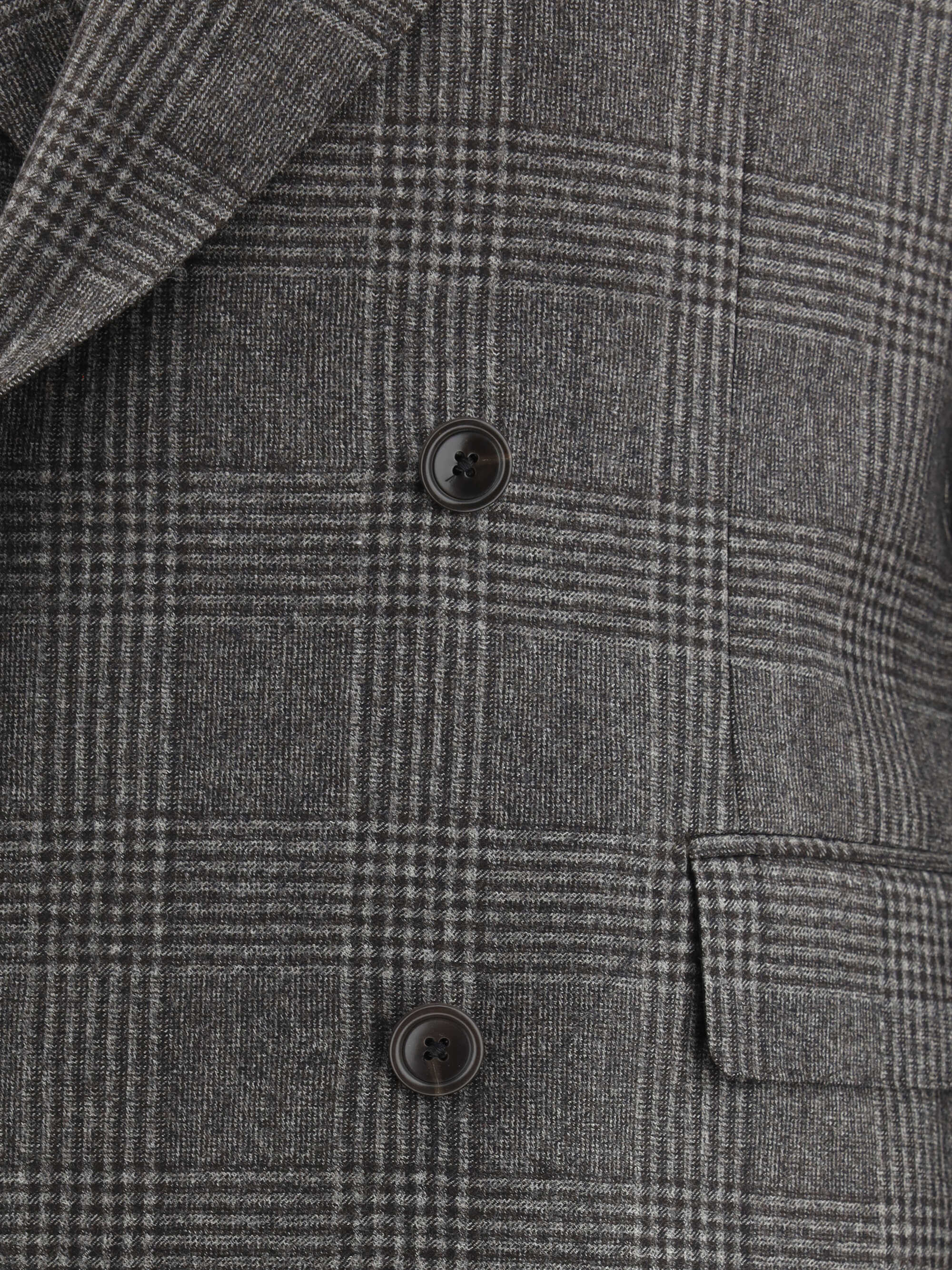 Virgin Wool Suit by Tagliatore, consisting of jacket and pants. Virgin wool blazer jacket, double-breasted front closure with matching buttons, two welt flap pockets on the front, one slit pocket on the front, peaked lapels, iconic brand logo applied on the lapel. Virgin wool classic pants, front zipper and hook-and-eye closure, two side slash pockets, two welt pockets on the back, waistband loops, all-over repeating check pattern.