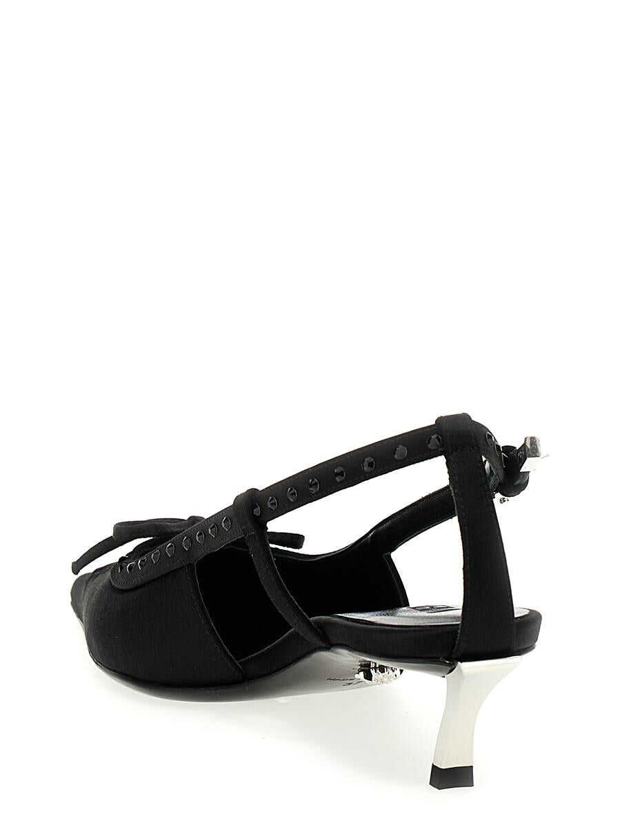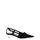 Satin slingback shoes with tone-on-tone rhinestones, front bow detail, pointed toe, and a metal heel