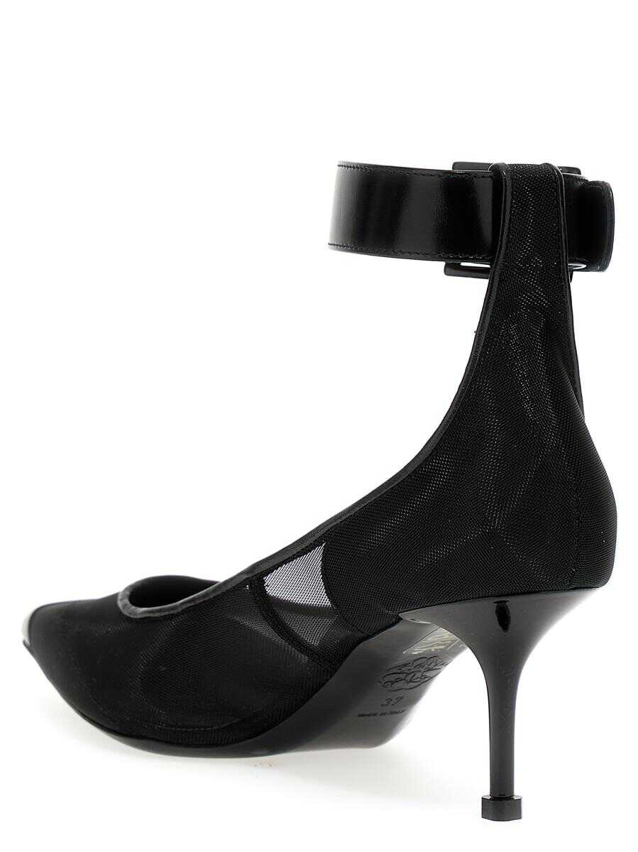 ‘Punk' pointed toe pumps featuring kitten keels, a mesh style, and an ankle strap with buckle