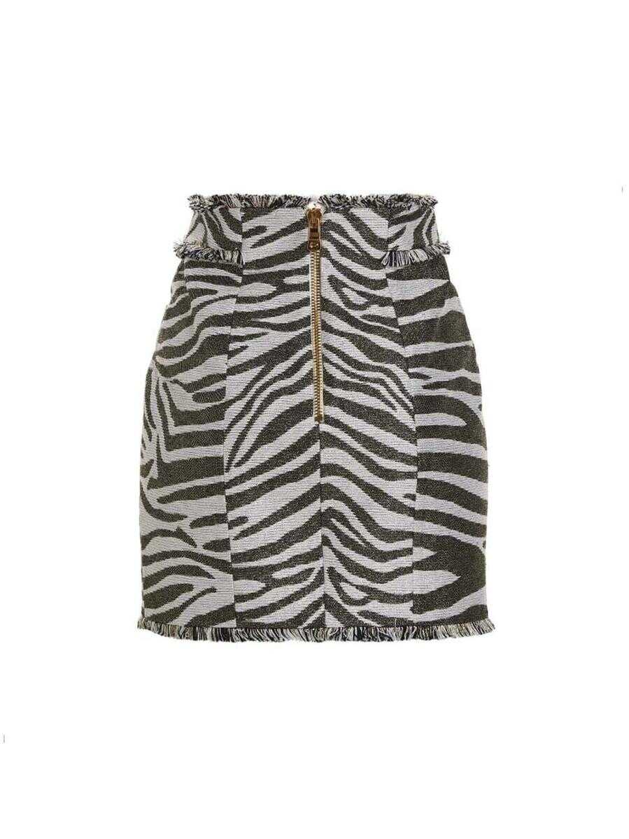 Fabric skirt with all over 'Lurex Zebra' pattern, front button applications, back zip closure, pockets and fringe detail