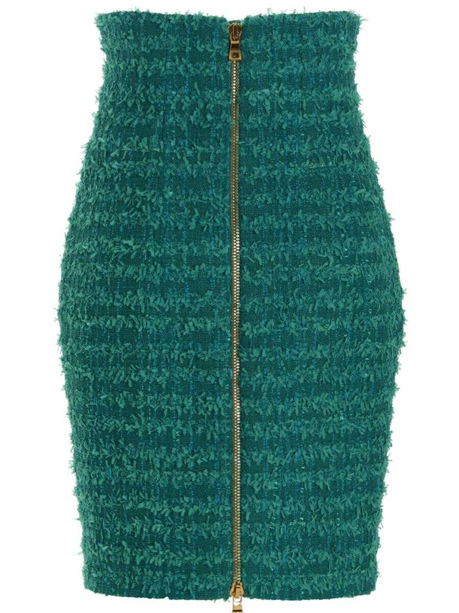 Tweed skirt with front logo buttons, zip closure at the back.back
