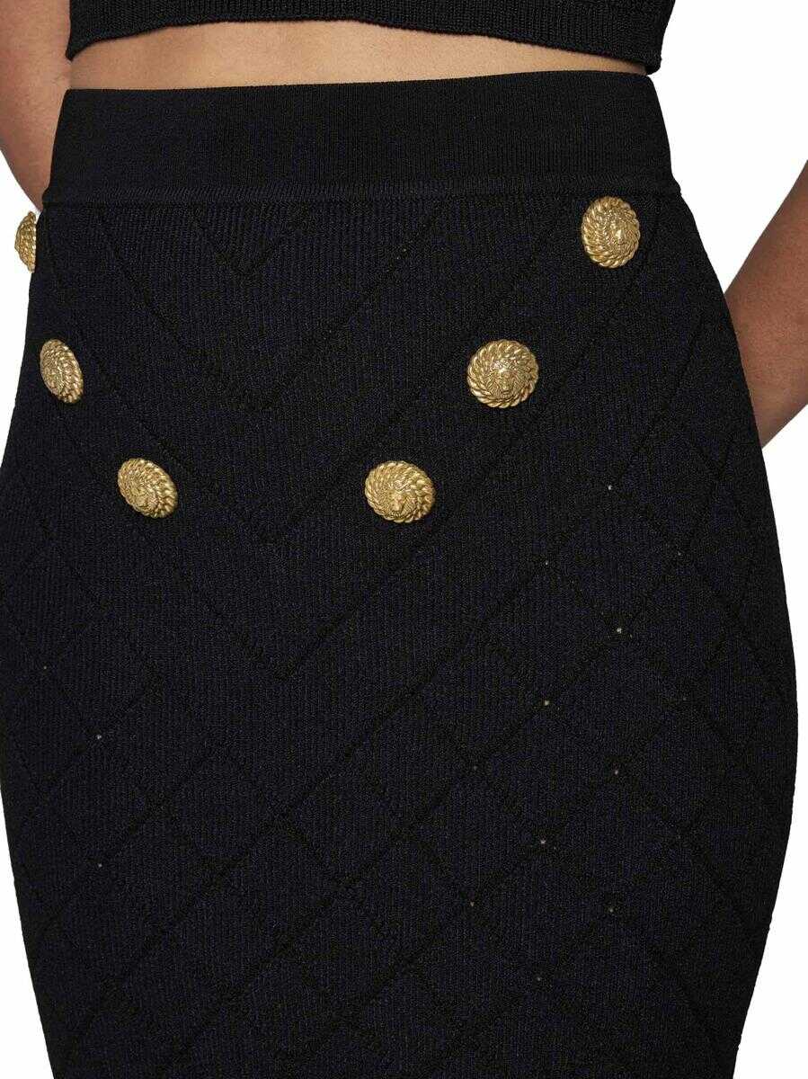 Balmain’s black viscose blend knit miniskirt featuring perforated diamond motif, signature embossed gold-tone buttons on the front, zip fastening at center back and fitted silhouette.
