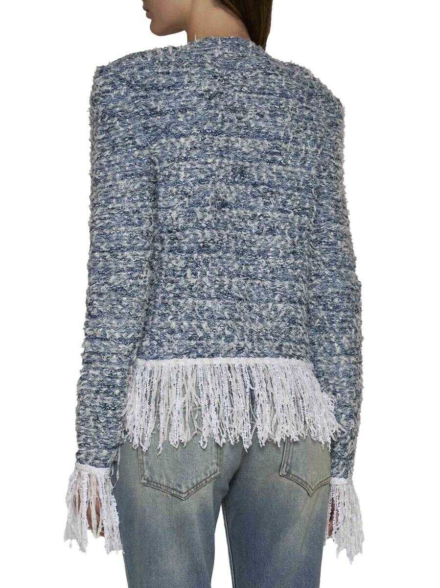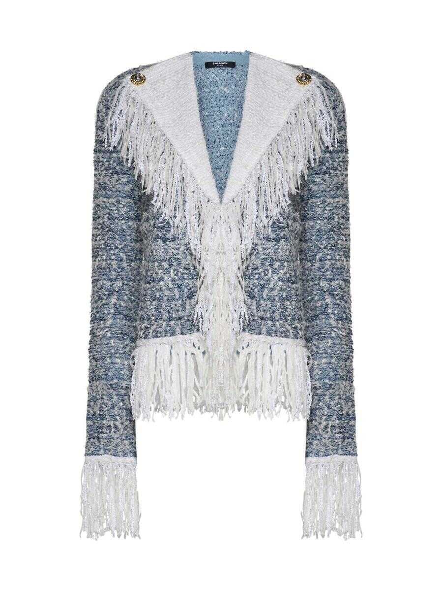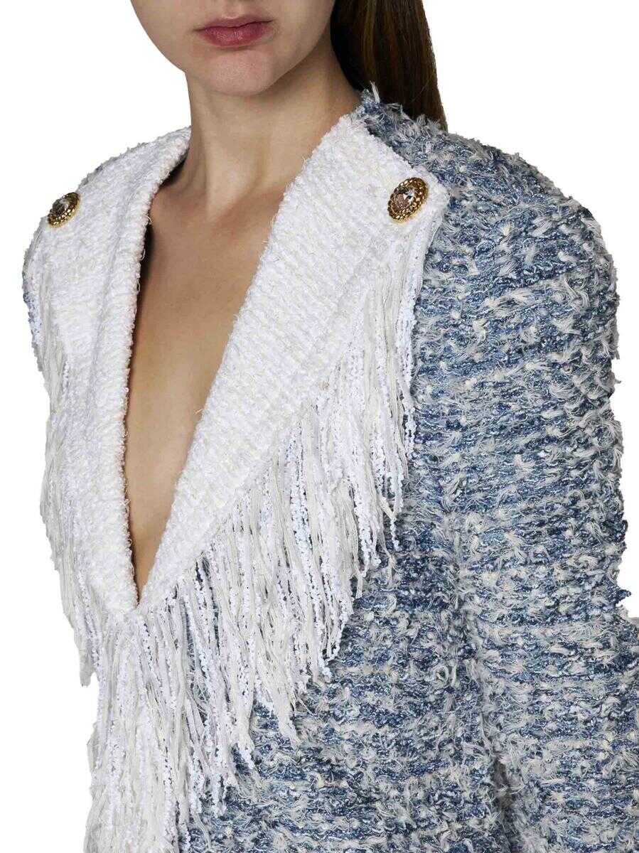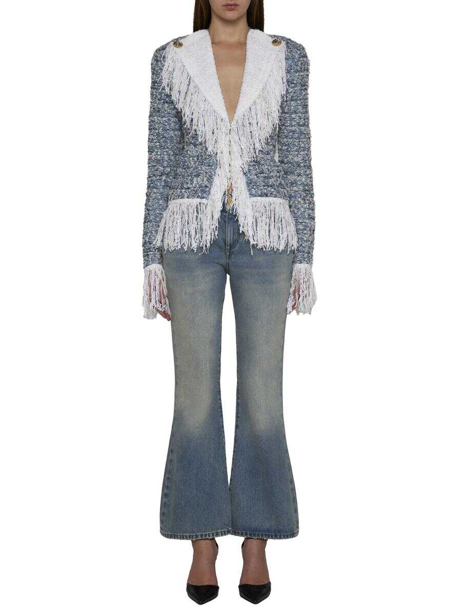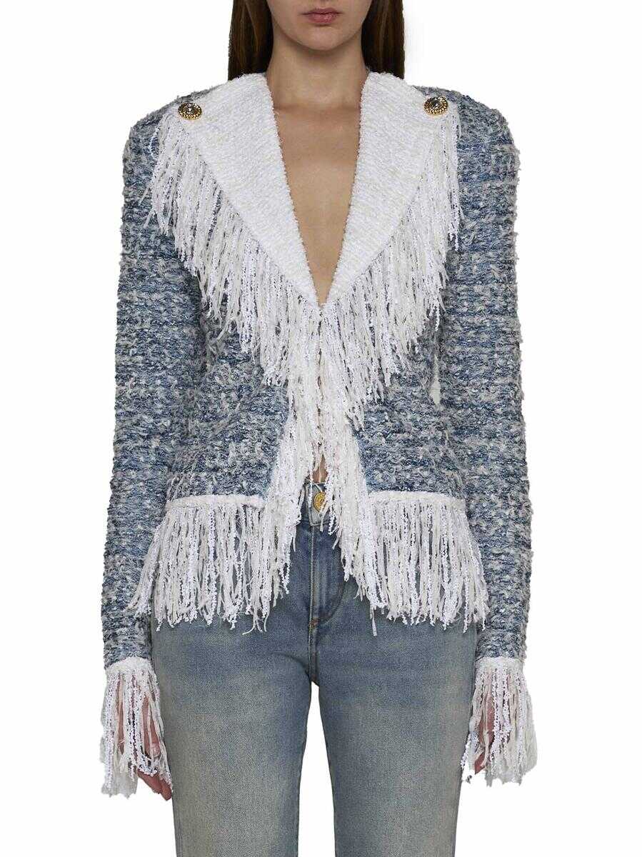 Balmain’s viscose and linen blend tweed blazer in shades of blue and grey featuring white decorative fringes along the pointed lapels, hem and cuffs, gold-tone metal buttons on the lapels, single-breasted hook-and-eye fastening, padded and shaped shoulder