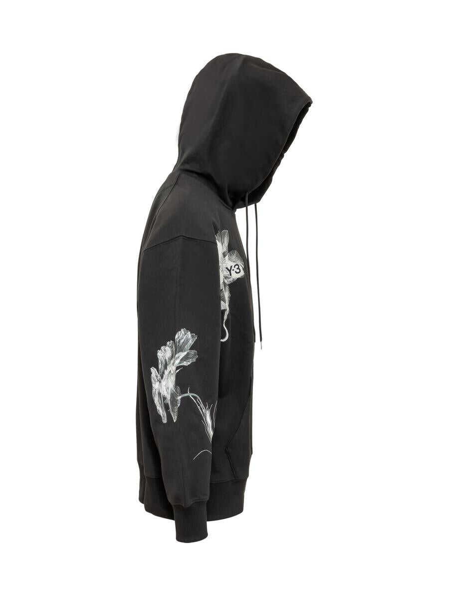 Long-sleeved sweatshirt. Drawstring hood. Ribbed hems. Single pocket. Printed logo on front. Floral print.