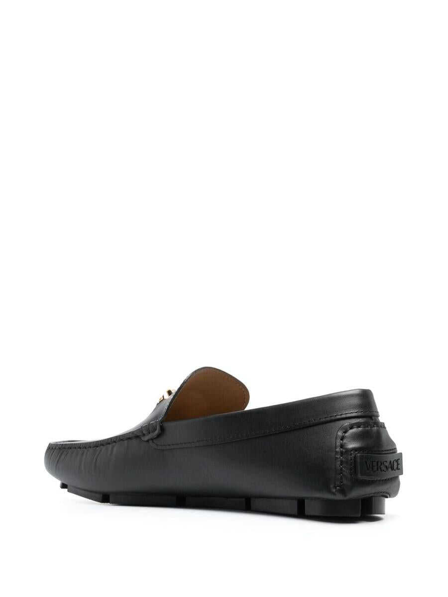 Versace La Medusa loafers in black calfskin leather. Gold Medusa head plaque. Engraved logo on the back. Round toe. Logo insole. Flat rubber sole. Slip-on design. Complete your tailored trousers with this comfortable loafer from Versace. - Versace - Calf leather - Black - Gold logo plaque - Men's