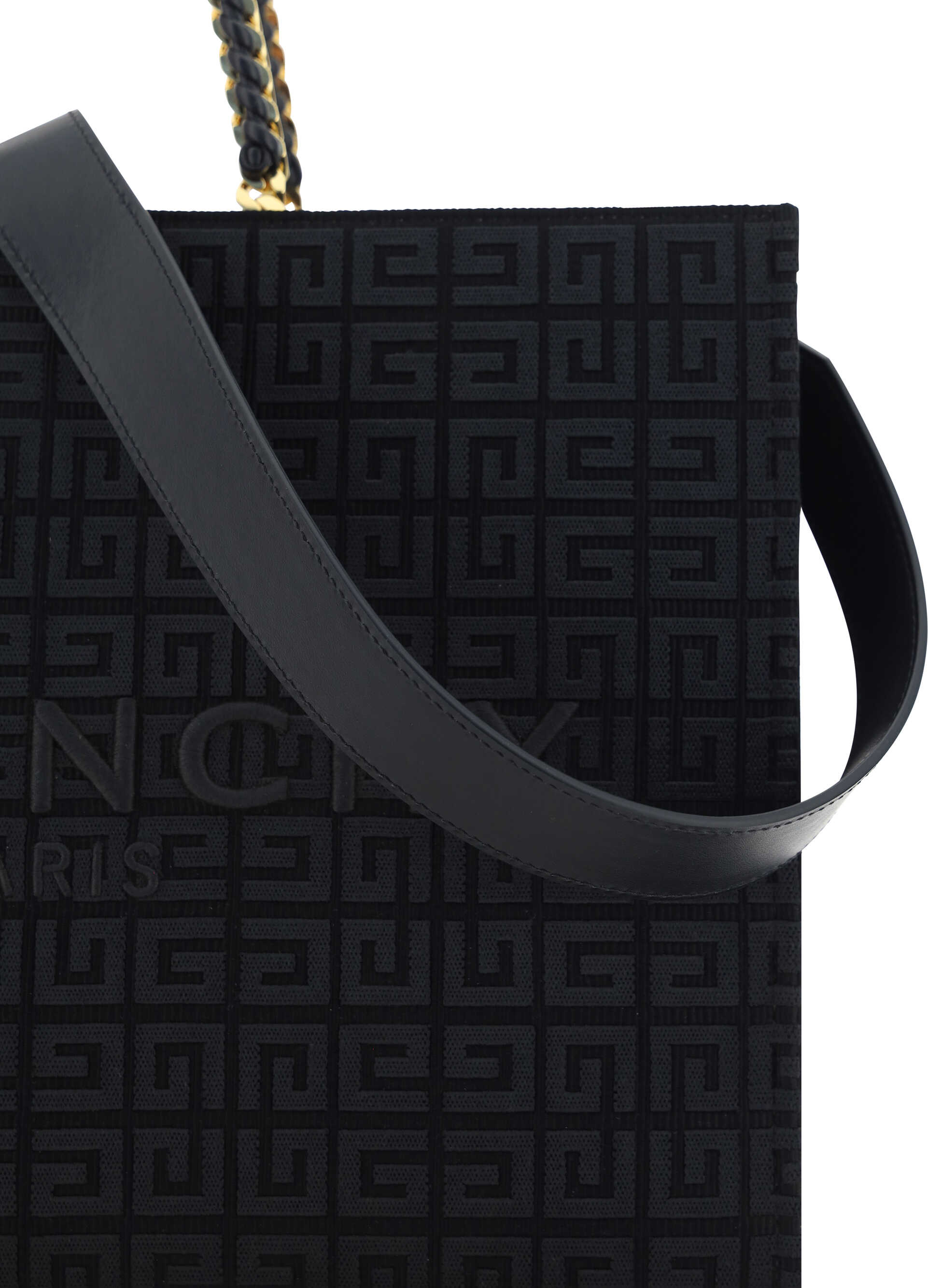 Fabric G-Tote Handbag by Givenchy, features woven chain handle with gold-plated details, removable and adjustable flat shoulder strap, fabric side panels with iconic all-over repeated tone-on-tone 4G logo, interior magnetic button closure, interior welt pocket.