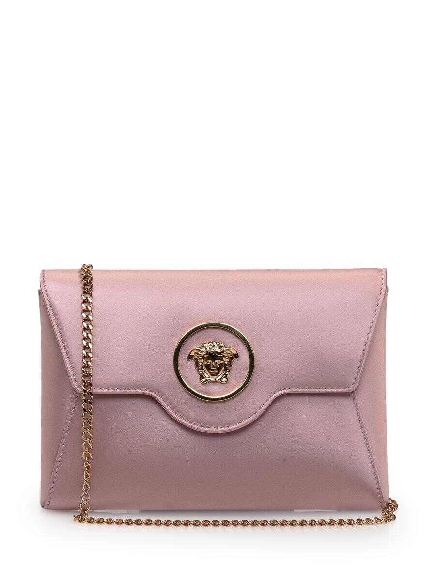 Pink satin envelope clutch bag. Removable shoulder strap. Interior compartment with card pocket. Gold metal La Medusa logo on front. Flap closure with magnetic button. Width: 20 Height: 13 Depth: 2