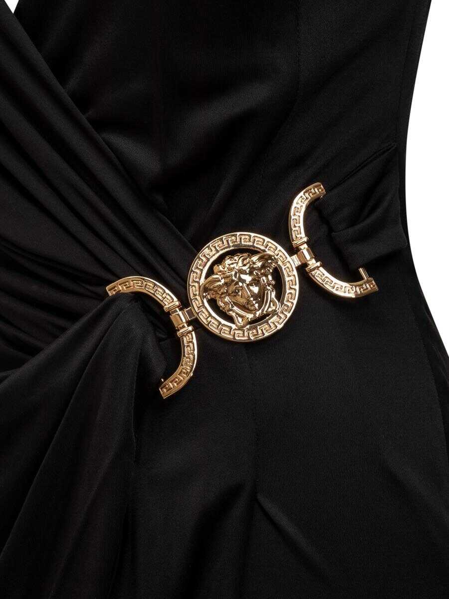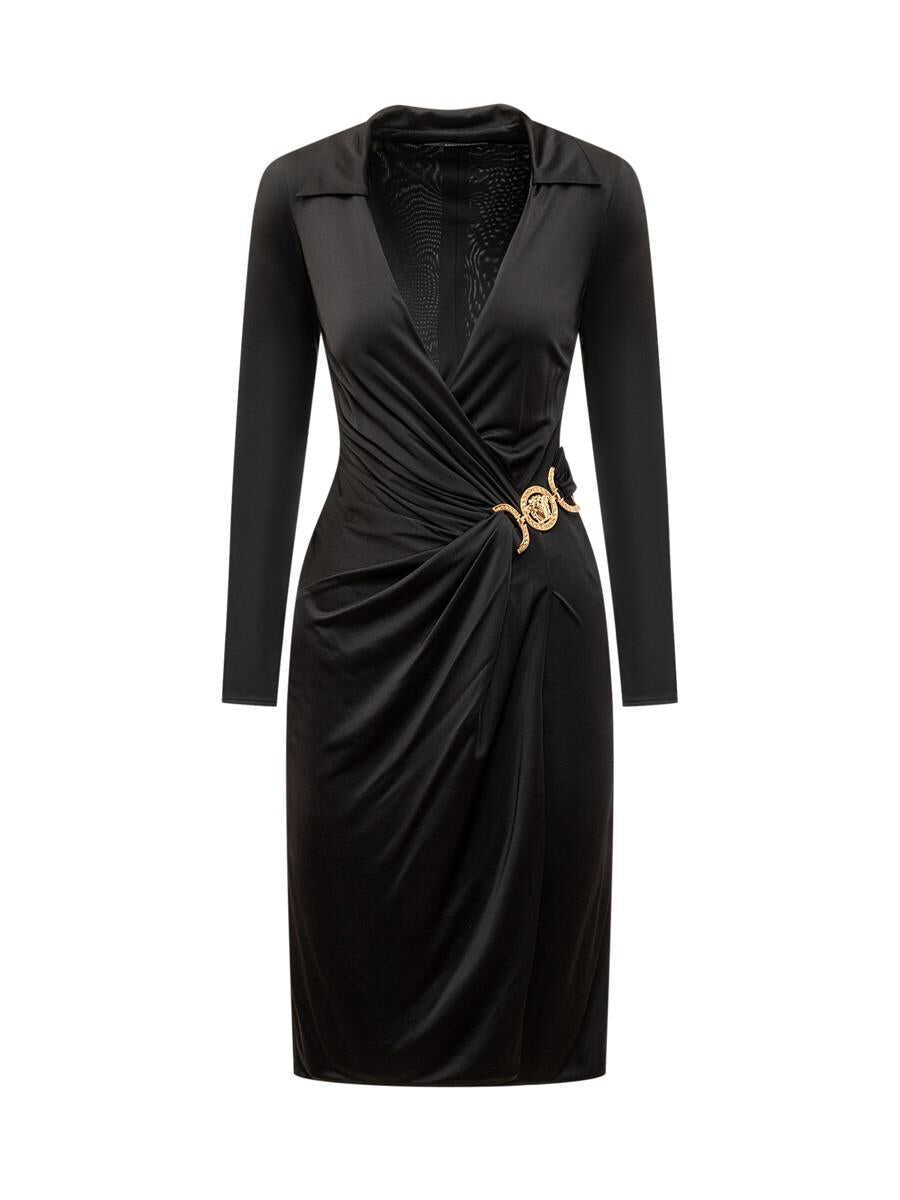 Long-sleeved midi dress in viscose. Collar with small lapels. Deep v-neckline. Side zipper closure. Draping with Medusa '95 personalization on front.