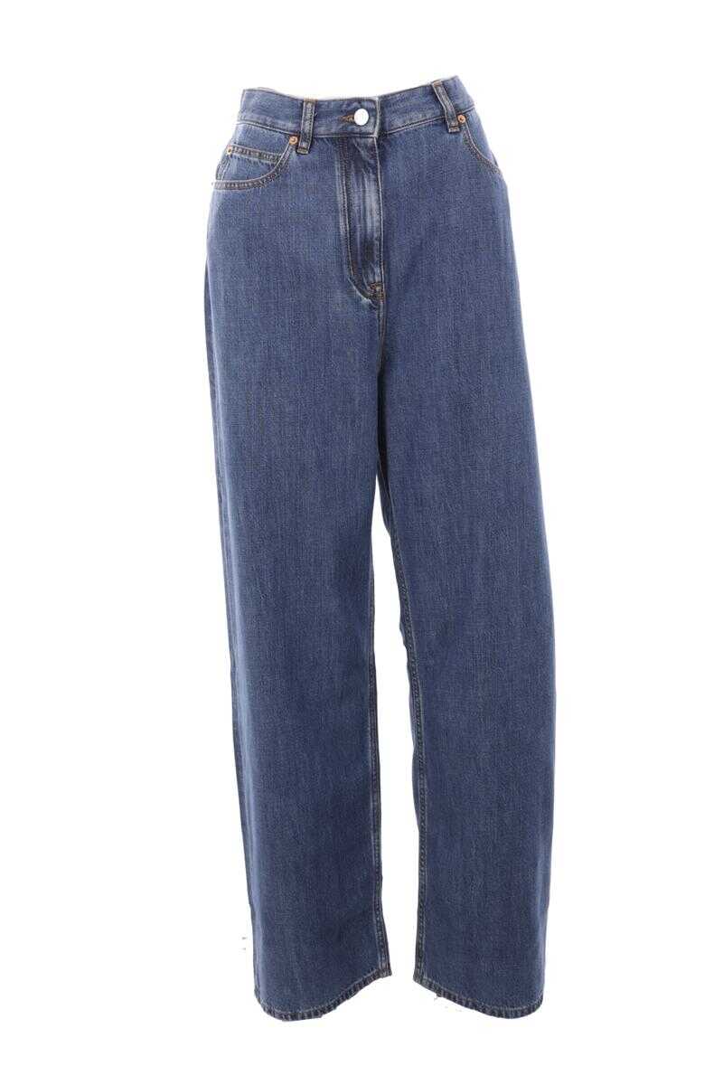 Valentino Garavani's wide-leg jeans crafted in blue cotton and lyocell denim. Featuring metal button / zip closure, belt loops, five classic pockets and leather logo patch at back waist.