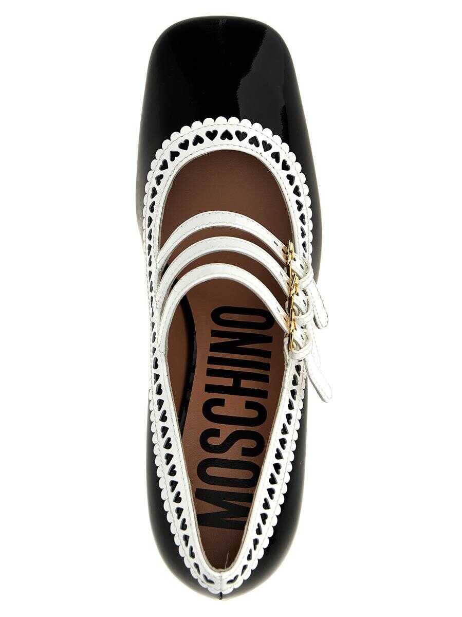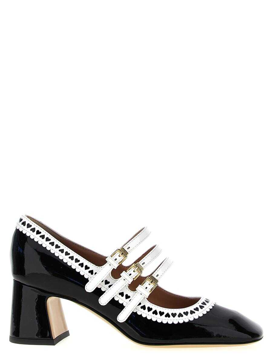 Patent leather pumps with contrasting finishing, heart-shaped perforated workmanship, adjustable straps with buckles