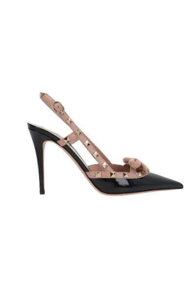 Valentino Garavani's slingbacks crafted in black patent leather with nude smooth leather trims adorned with signature platinum-tone metal studs. Featuring adjustable ankle strap with metal bucke, a point-toe silhouette, decorative bow, leather lining and leather sole. The design is completed by a patent leather-covered stiletto heel.