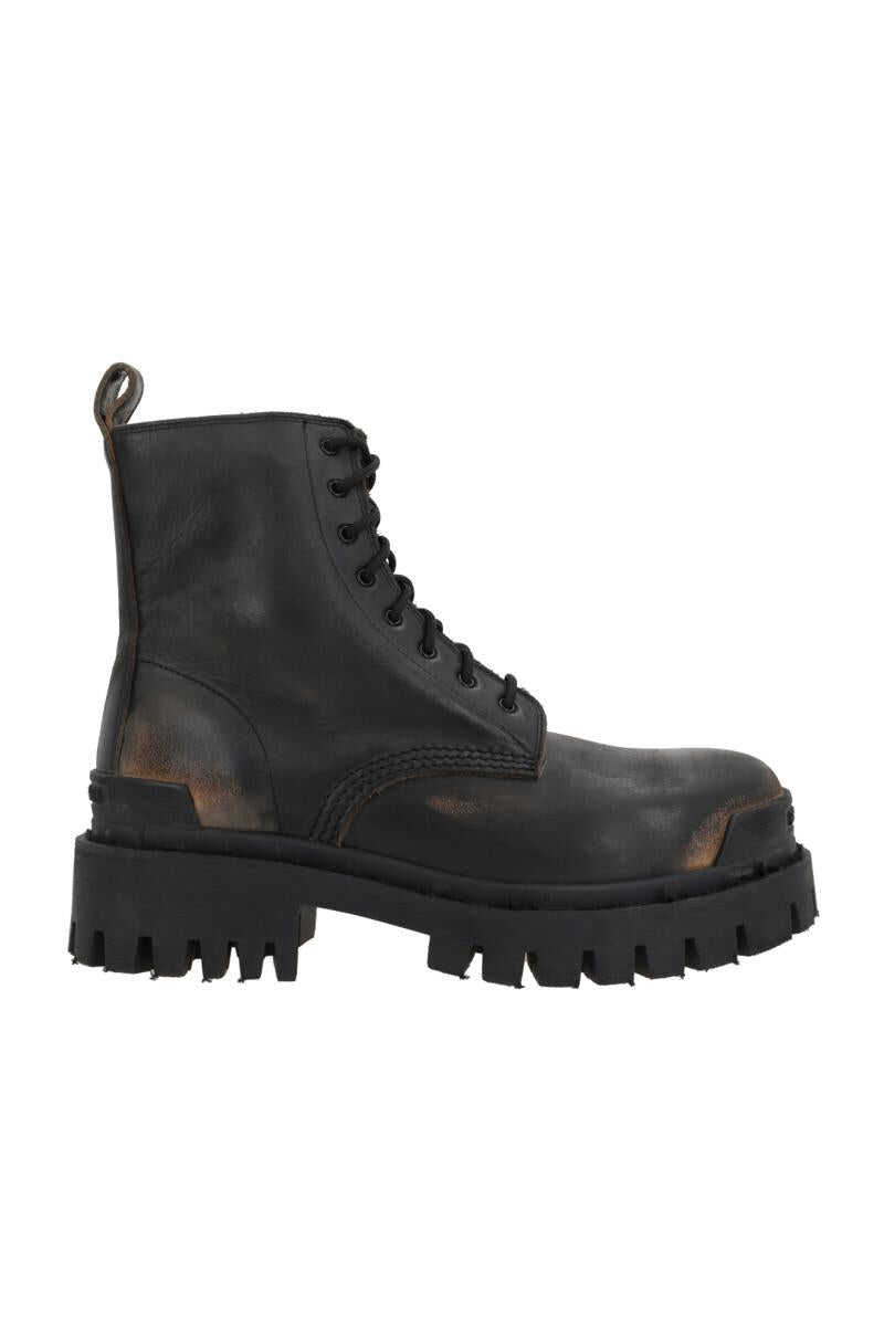 Balenciaga's combat boots crafted in black and brown leather with a vintage finish. Featuring lace-up closure, round toe, leather lining and lug rubber sole. The design is completed by the unmistakable embossed logo lettering on the toe and heel.