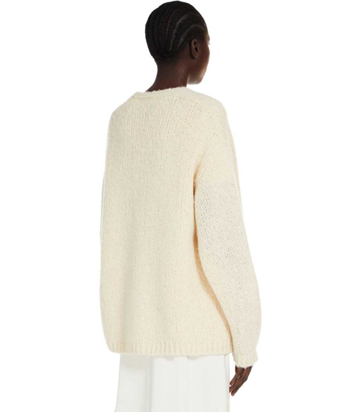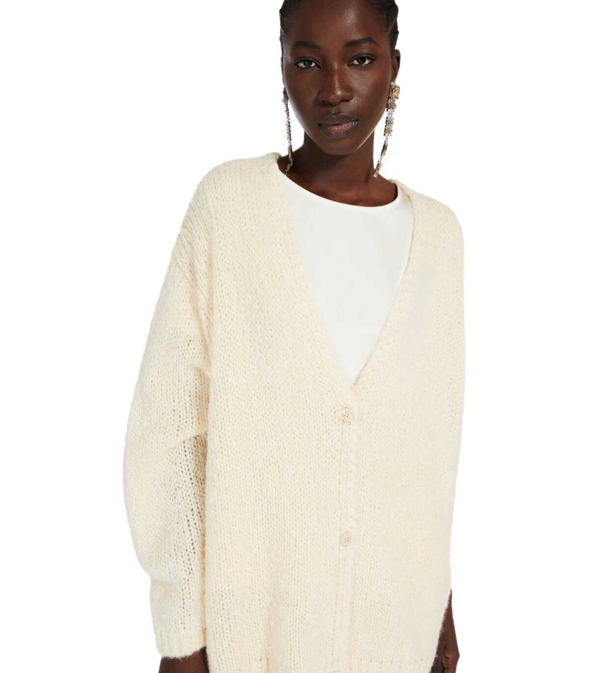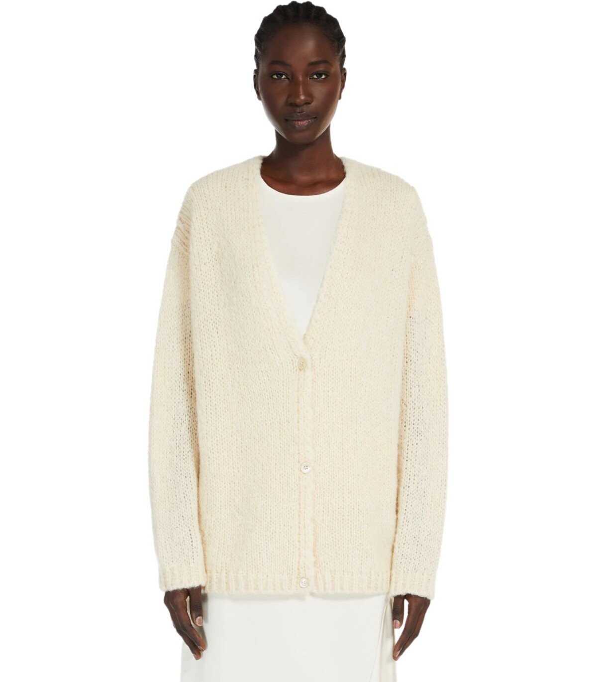 Max Mara Weekend cardigan made of fine alpaca and cotton yarn, in ecru color. Characterized by a closure with mother-of-pearl buttons, it features soft long sleeves and a V-neck. Finished with ribbed edges. Oversized fit.