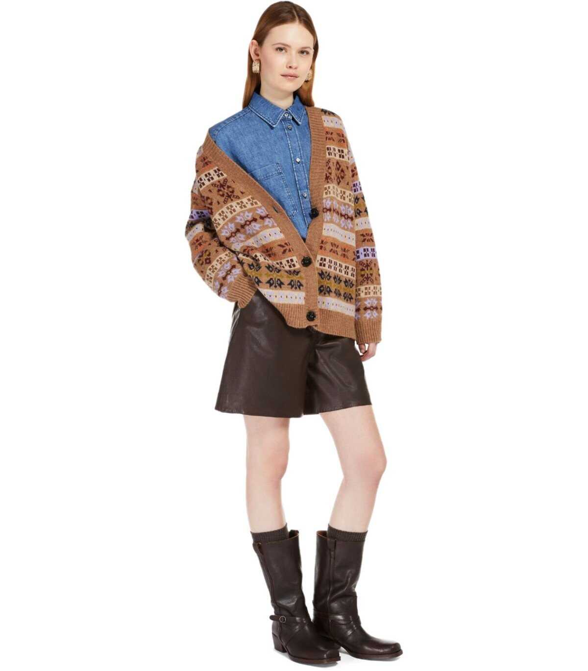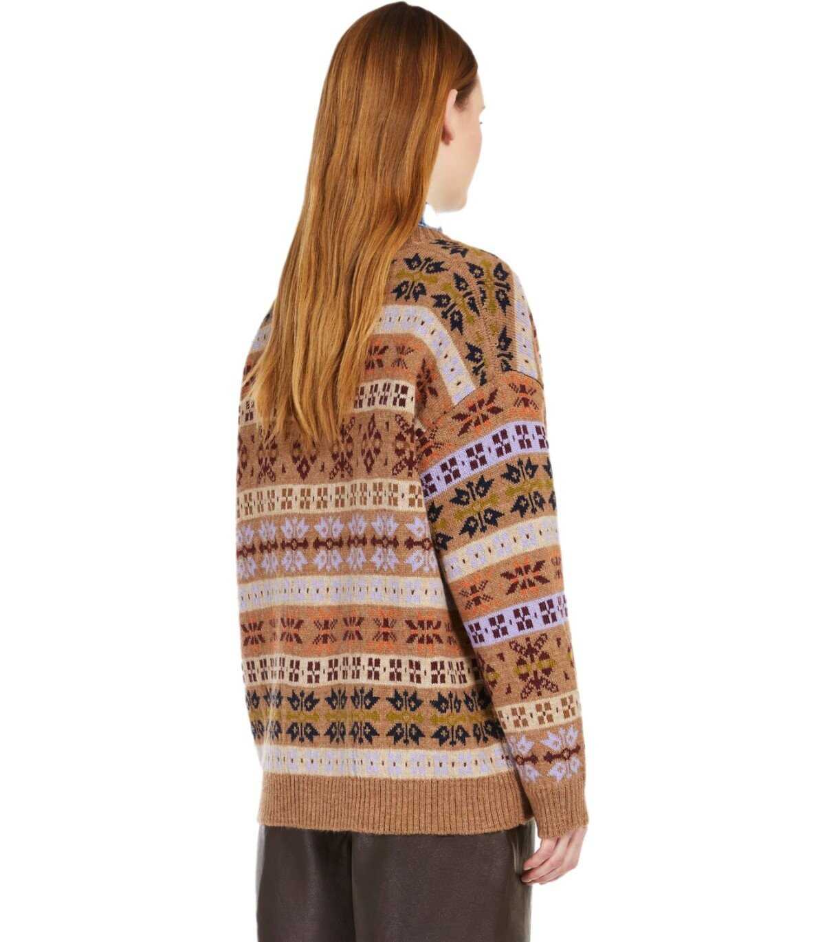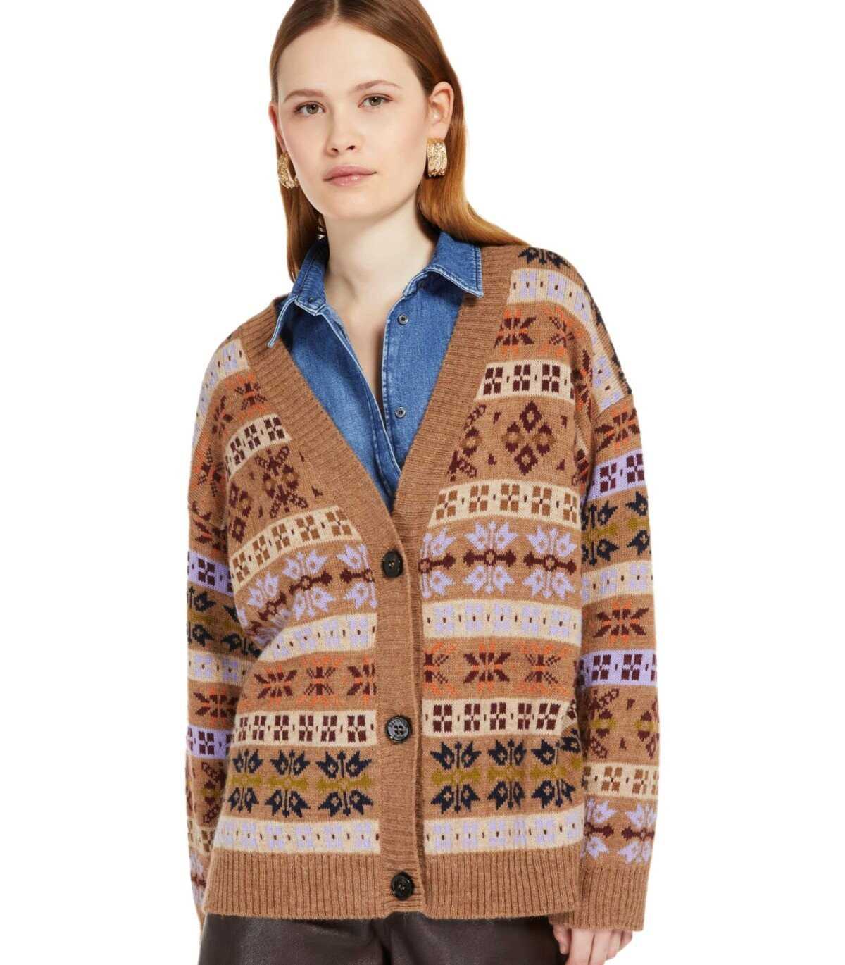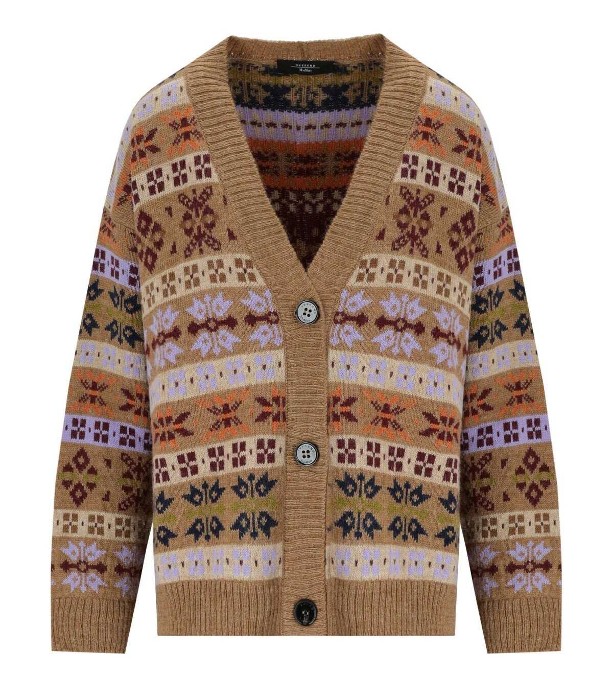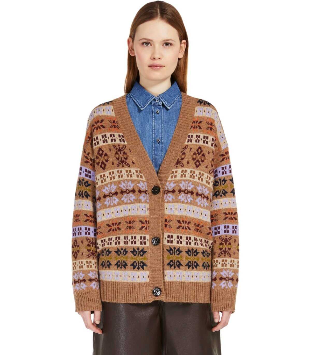 Max Mara Weekend Eccelso cardigan made of wool and alpaca yarn in a hazelnut color. Characterized by a horn-effect button closure, it features long, low-set sleeves and a V-neck. Finished with ribbed edges, it is decorated with an all-over jacquard pattern. Oversized fit.