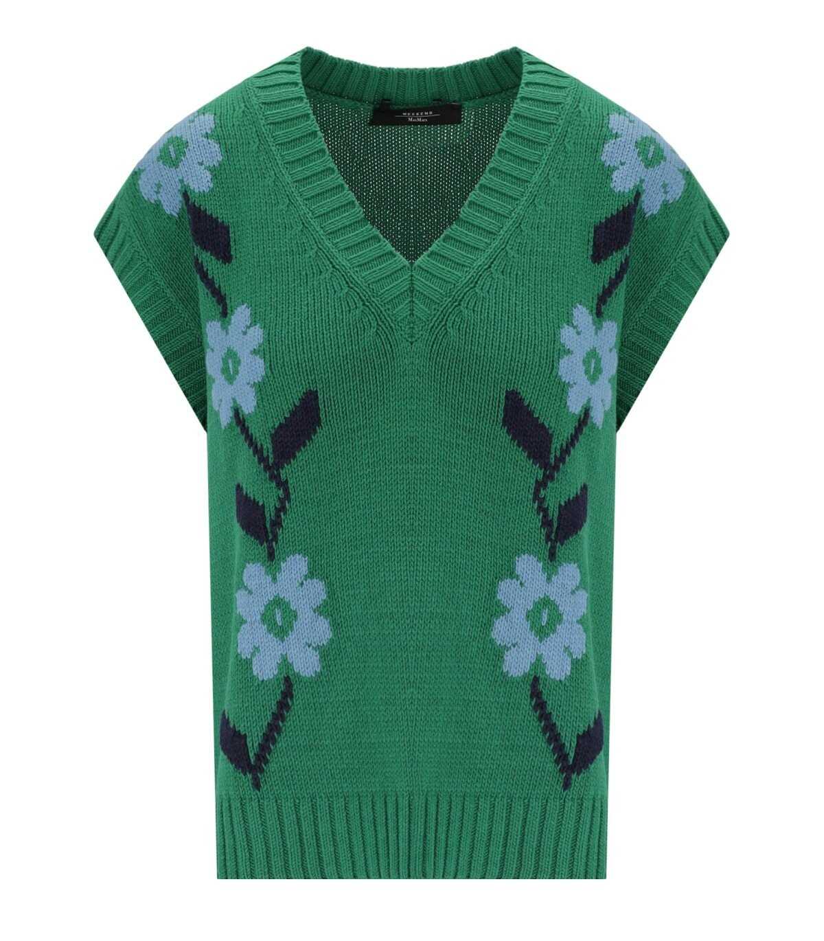 Max Mara Weekend Austria cardigan made of cotton yarn in green. Characterized by a V-neck, it has a regular length. Adorned at the front with an inlaid floral pattern, it features ribbed finishes. Oversized fit.
