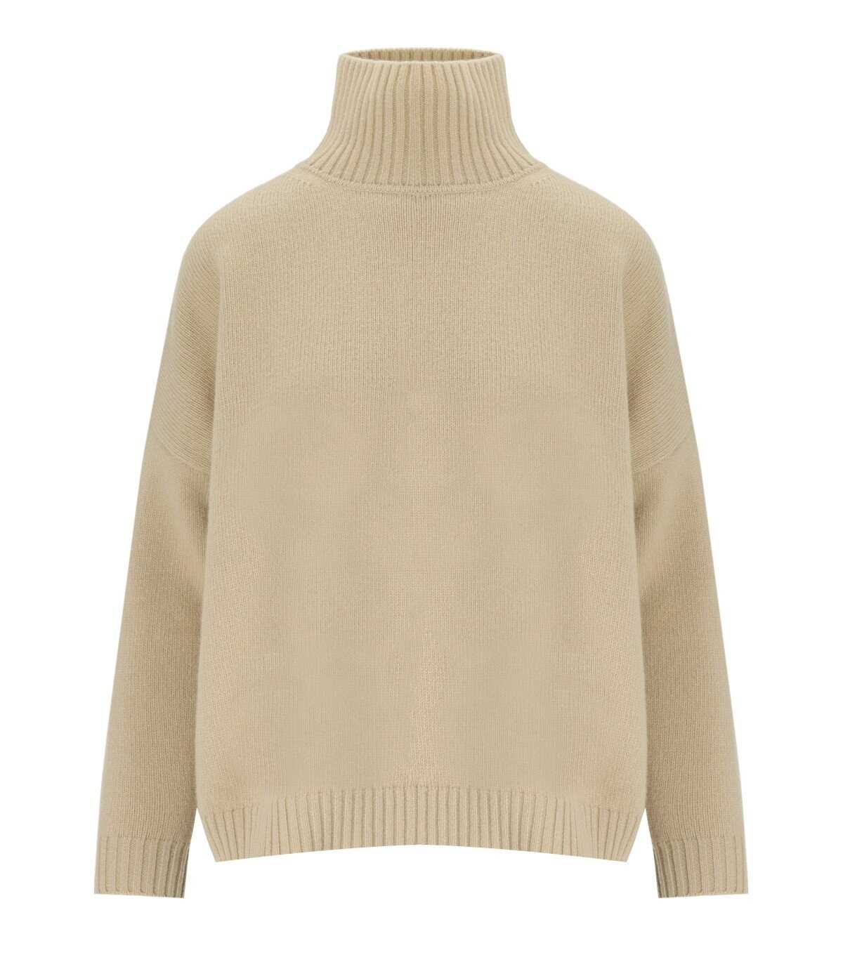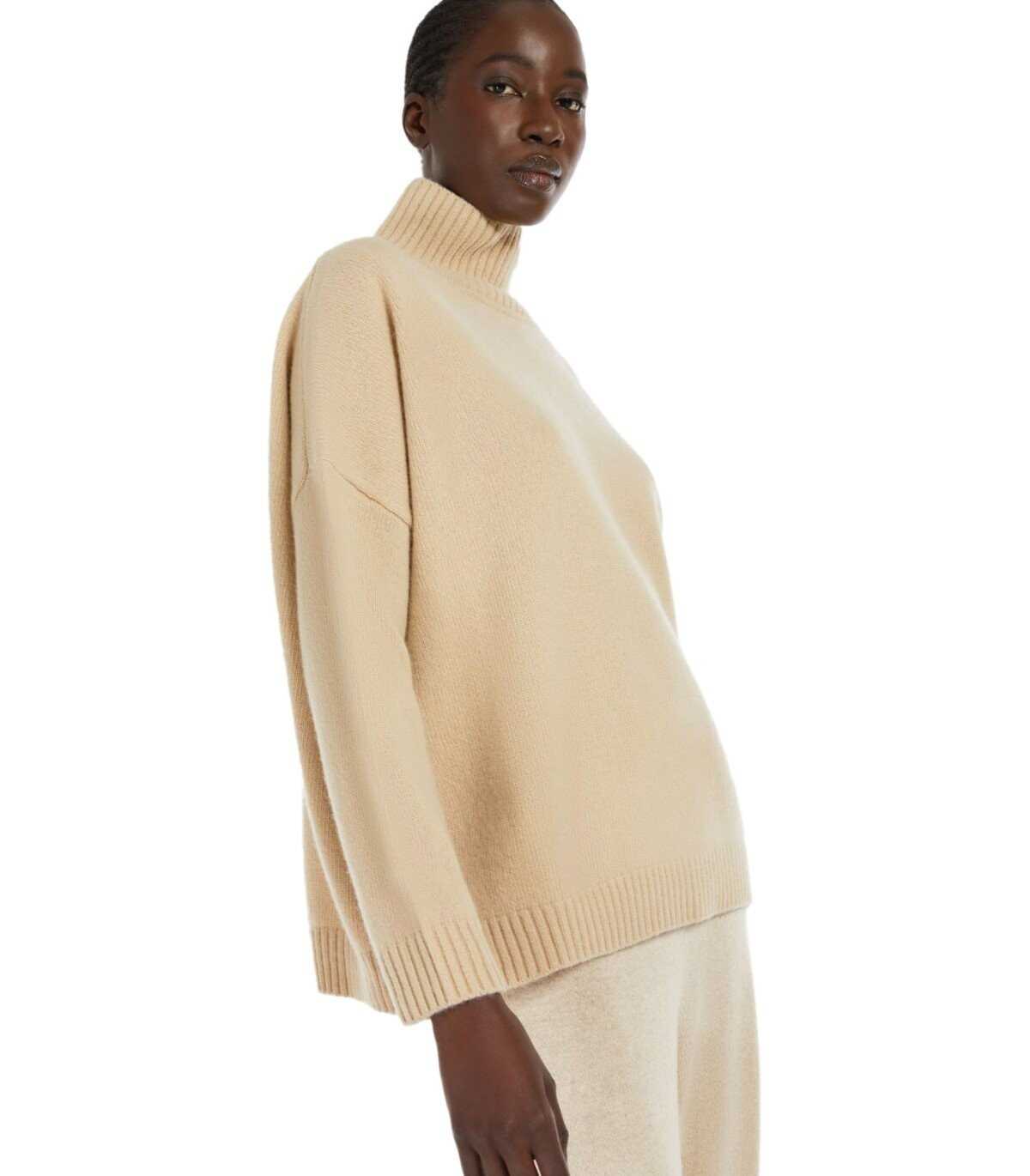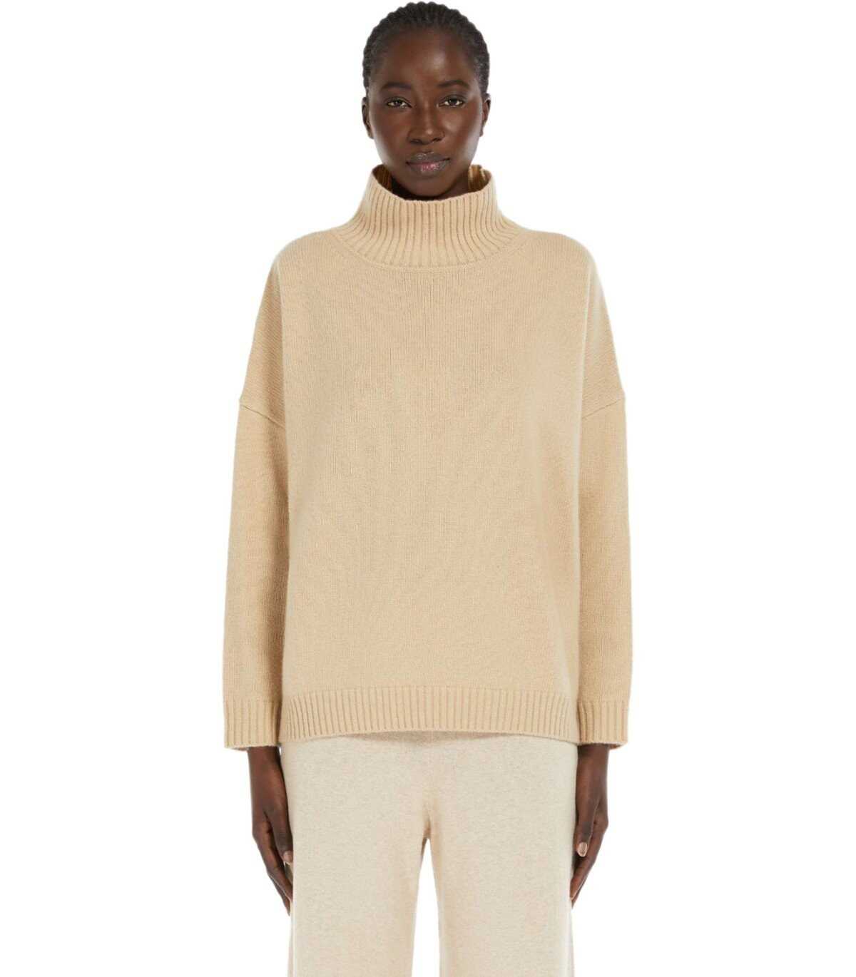 Borgia turtleneck jumper by Max Mara Weekend made of virgin wool yarn, in a camel color shade. Characterized by long, low-cut sleeves and a high collar, it is knitted in stockinette stitch. Oversized fit.