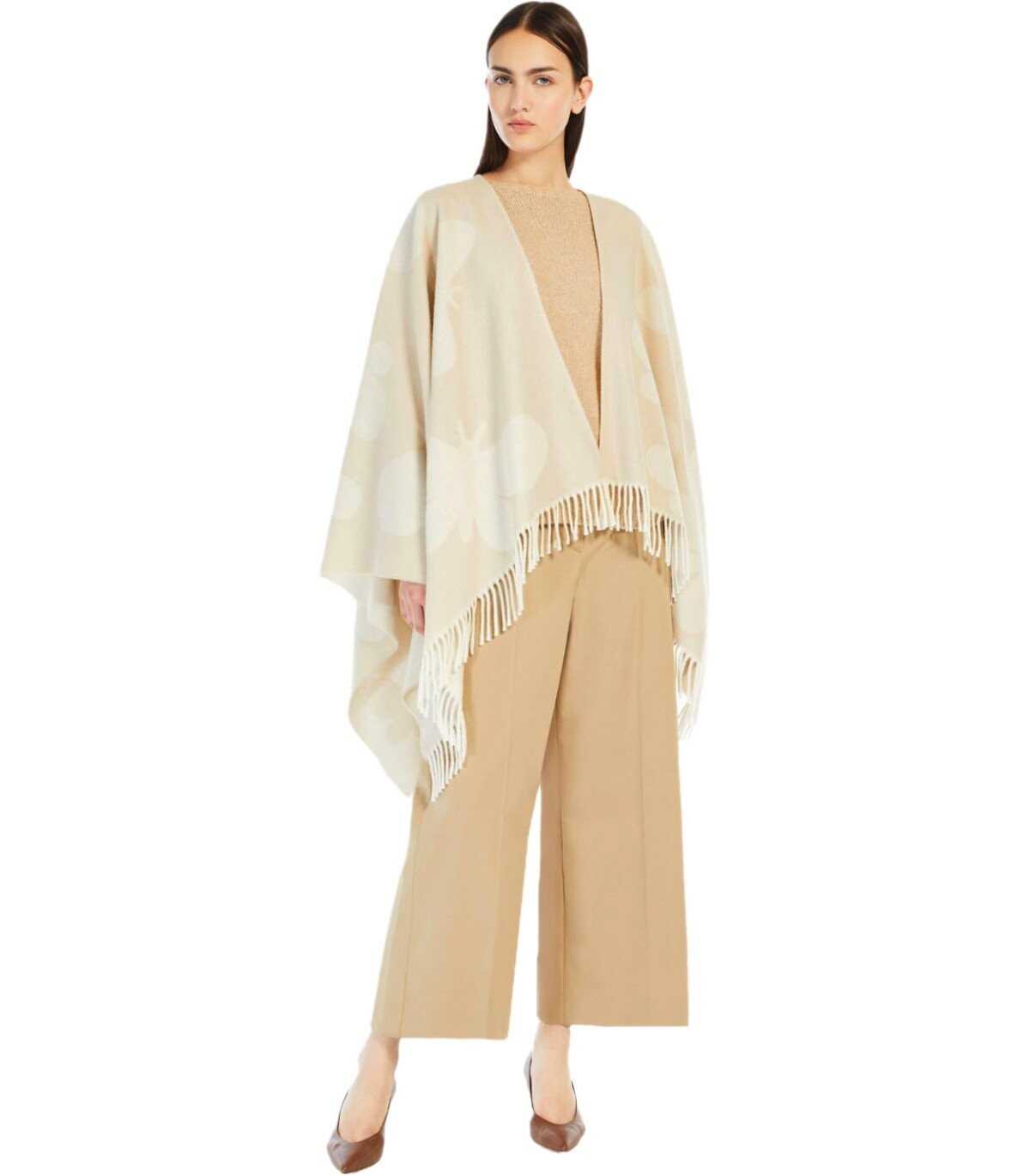 Pace cape by Max Mara Weekend made of precious virgin wool fabric, in ivory color. Adorned with a fringe pattern at the bottom, it features an all-over jacquard butterfly design. Measurements 146 x 150 cm.